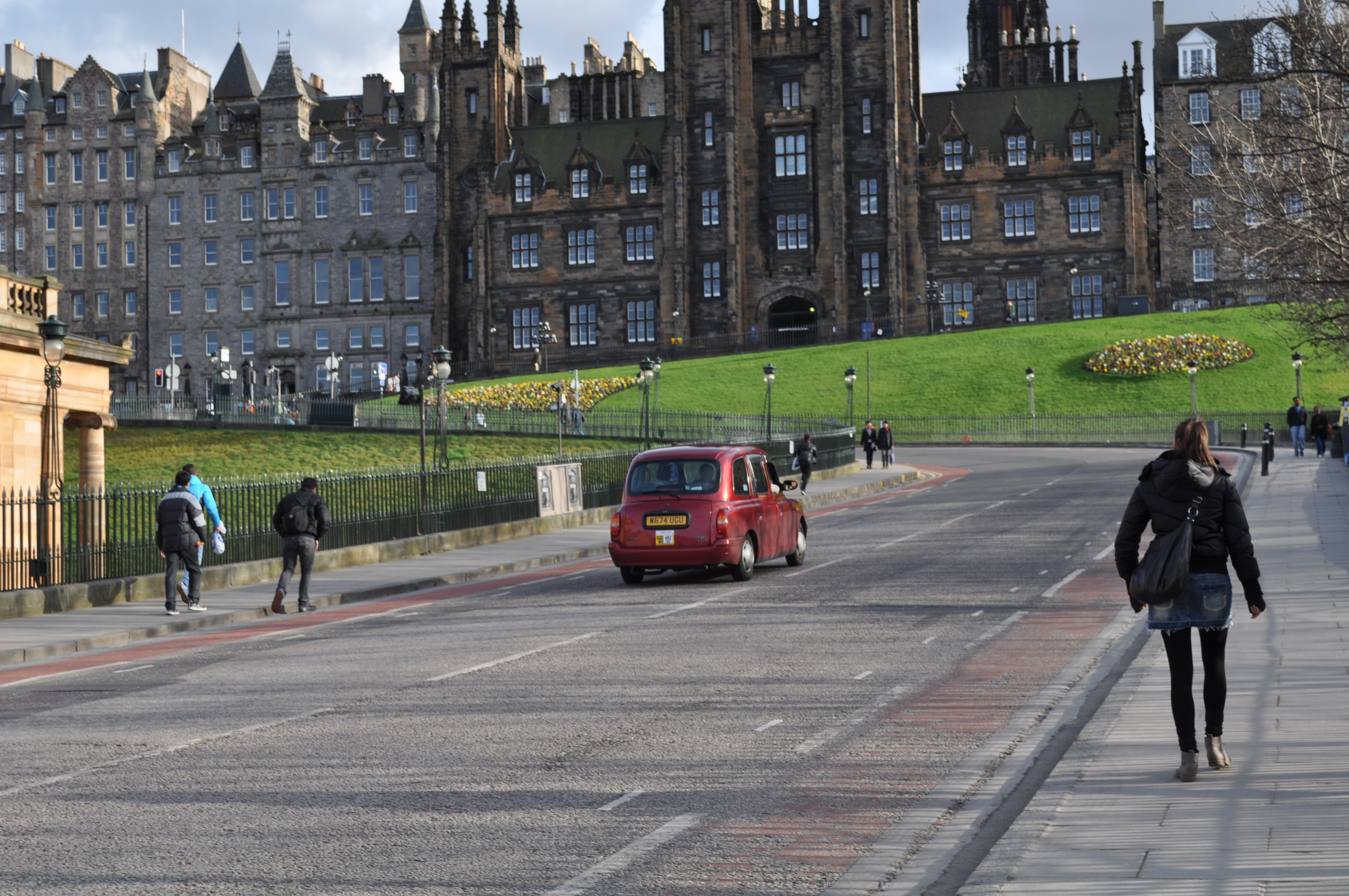 Luckily, there’s also a whimsical side to Edinburgh, or at least its mass transit.  Most of the buses teeter along the road, seemingly half too tall for their width, and many have tartan-clad seats.  Most of the taxis (which are plentiful) look like something out of the 1940s.  So, unusually enough, I found the city’s roads more interesting than its sidewalks.