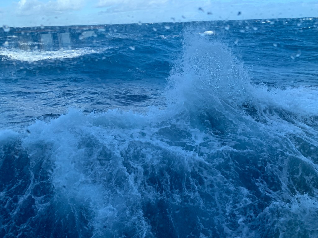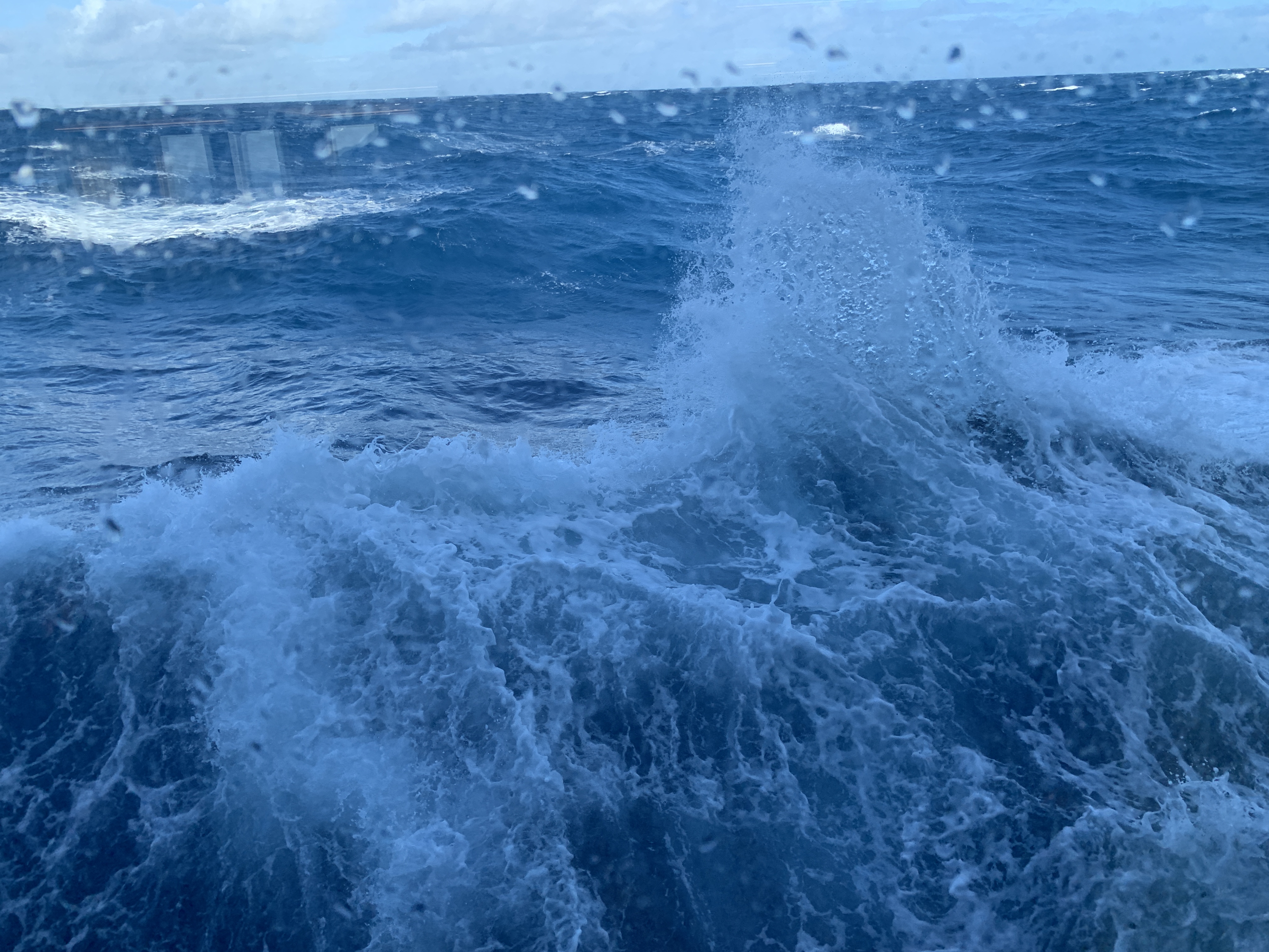 At an information session last night, the expedition leader said to expect a bumpy night and lots of bouncing around today. And so it was, and so it is. Twice during the night I almost fell out of bed because the cabin was pitching so wildly. Today, we’re sailing through 18-foot waves in a gale (8 on the Beaufort Scale). The spray reached as high as our balcony on the sixth deck, roughly 75 feet above the water line. Thank you, scopolamine!