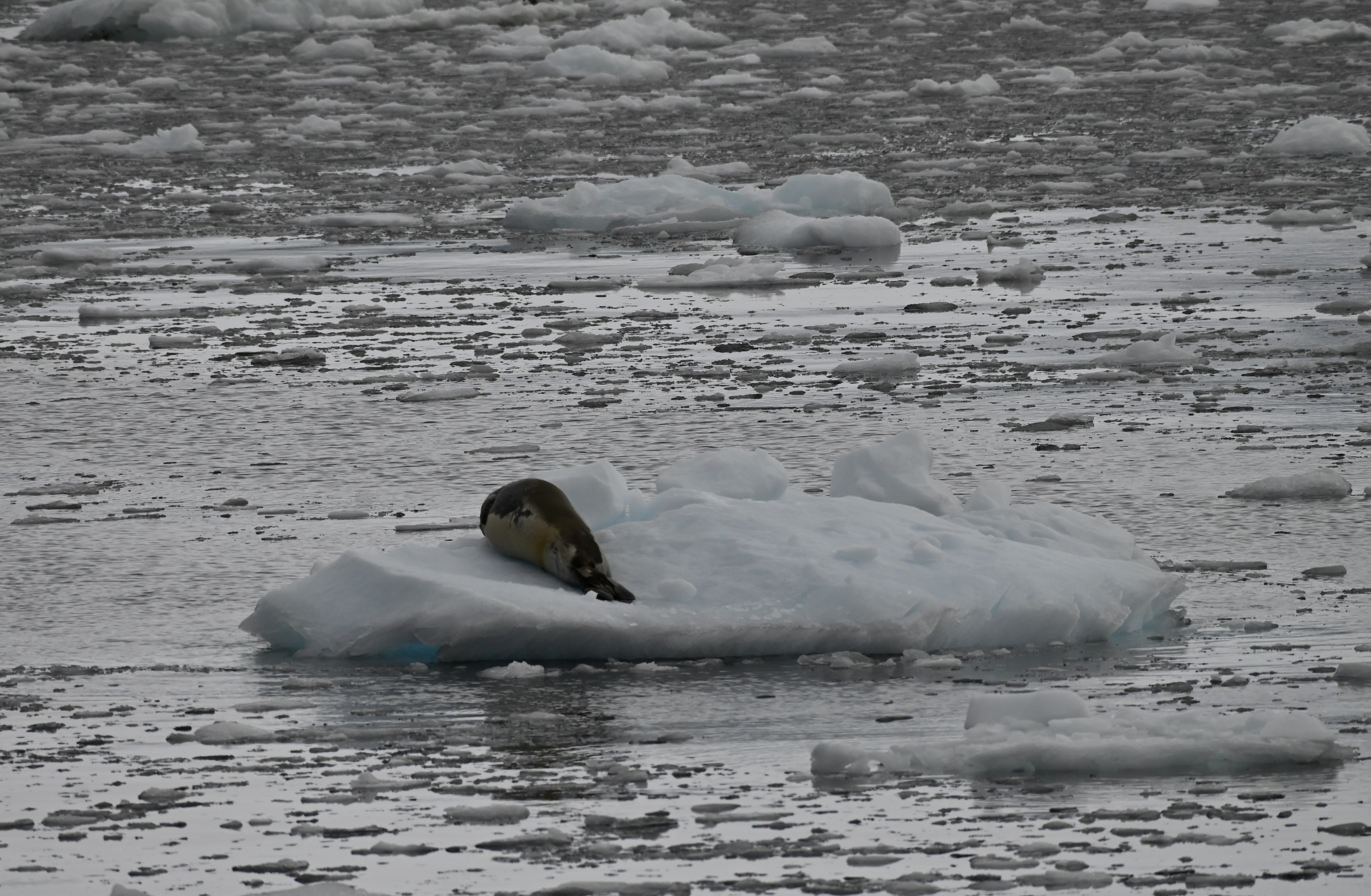 The bay is something of a parking lot for ice bergs, “bergy bits,” and smaller fragments that reminded me of shaved coconut, popcorn, and packing peanuts. Ice bergs, I discovered, are like clouds: with imagination they can evoke all manner of things. One was shaped like the State of Virginia, another like a house with eaves, a third like a sinking ship, etc. And then there are the run-of-the-mill tabular bergs, which look like buttes. (Don’t mesa with them!)