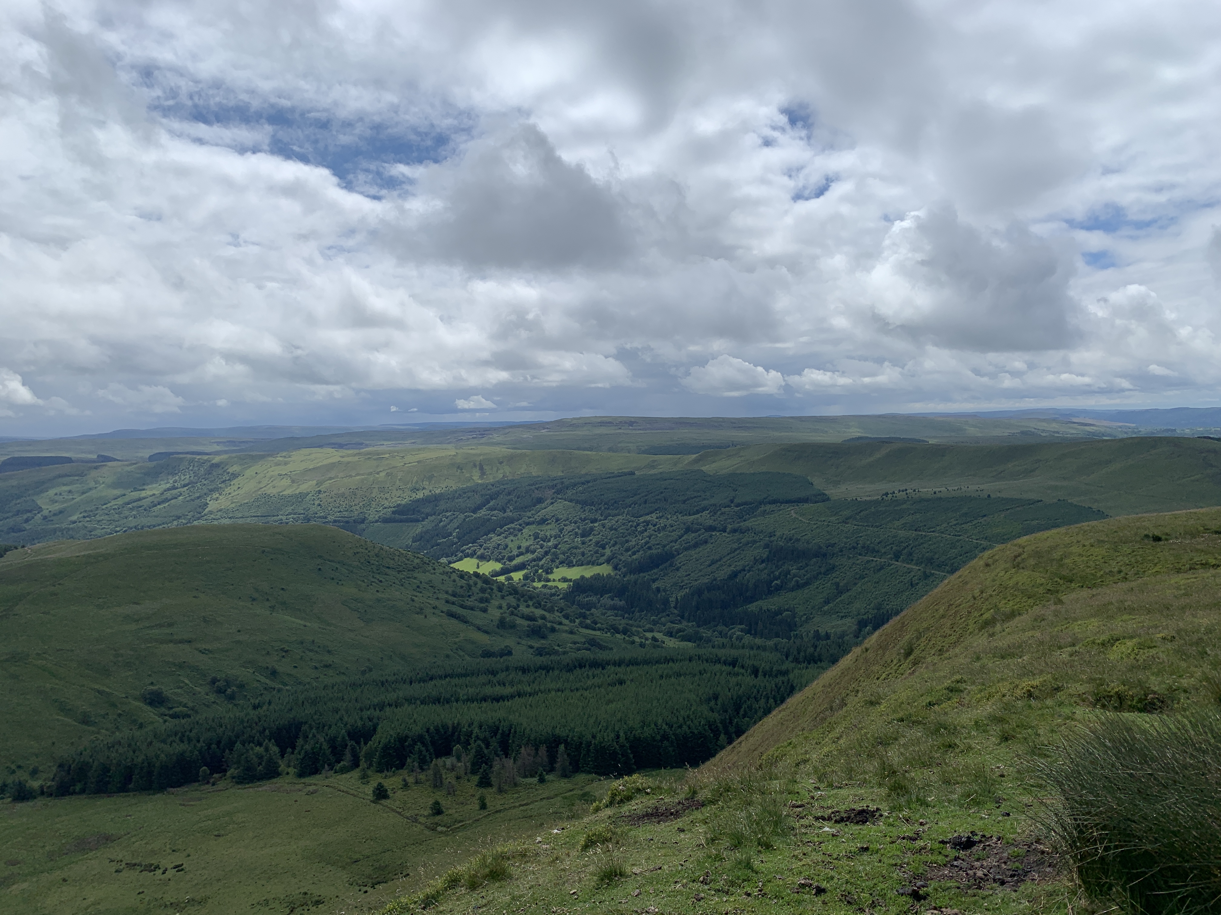 Fan-y-Big has something in common with Pluto: it has been demoted from “mountain” to hill”; apparently, it’s high enough to be deemed a mountain but narrowly misses another criterion for mountainhood. The trail to the top winds through sheep-filled fields (and is frequently paved with their droppings), and the mountain is home to wild ponies. I ambled through a group of six ponies (including one foal), all of which were supremely indifferent to my presence. Several kinds of purple, blue and white wildflowers punctuated the green fields, and the valley was quilted with farms.