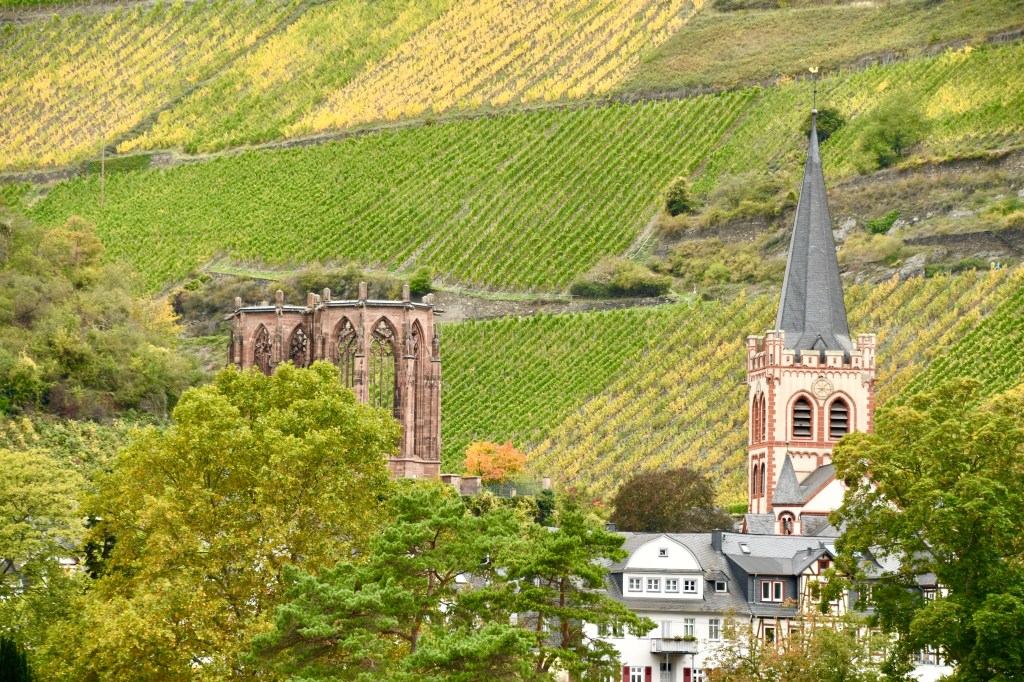 In the afternoon, we glided down the Middle Rhine Valley, home to vertiginous vineyards, dour castles, and picture book villages, each with its own gleaming white church. The scenery is often spectacular but (jaded traveler that I am) a bit repetitive; oh look, here’s another quaint little town, and up on the hill there’s another hulking castle from centuries ago.