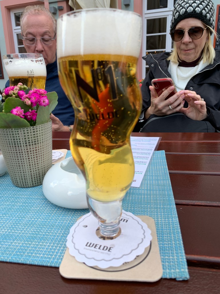 What can I add after stopping here? Cologne is vibrant, bustling, and – after Amsterdam – mercifully free of crazed cyclists. The cathedral is imposing. Kolsch ale (the local specialty, produced by countless breweries) is very light and tasty but can pack a punch. The old town (Alter Stadt, which does not mean altered state, which is much more likely in Amsterdam) is charming, with cobbled-stone streets, shop-lined alleys, and tree-shaded squares. And there’s a lot of money here: in the shadow of the cathedral I saw stores selling Leica cameras and Hasselblad lenses (I may have drooled on their window), Rolex and Tag Heuer watches (less drool), and similarly high-end perfumes, crystal, china, etc. (saliva-free windows).