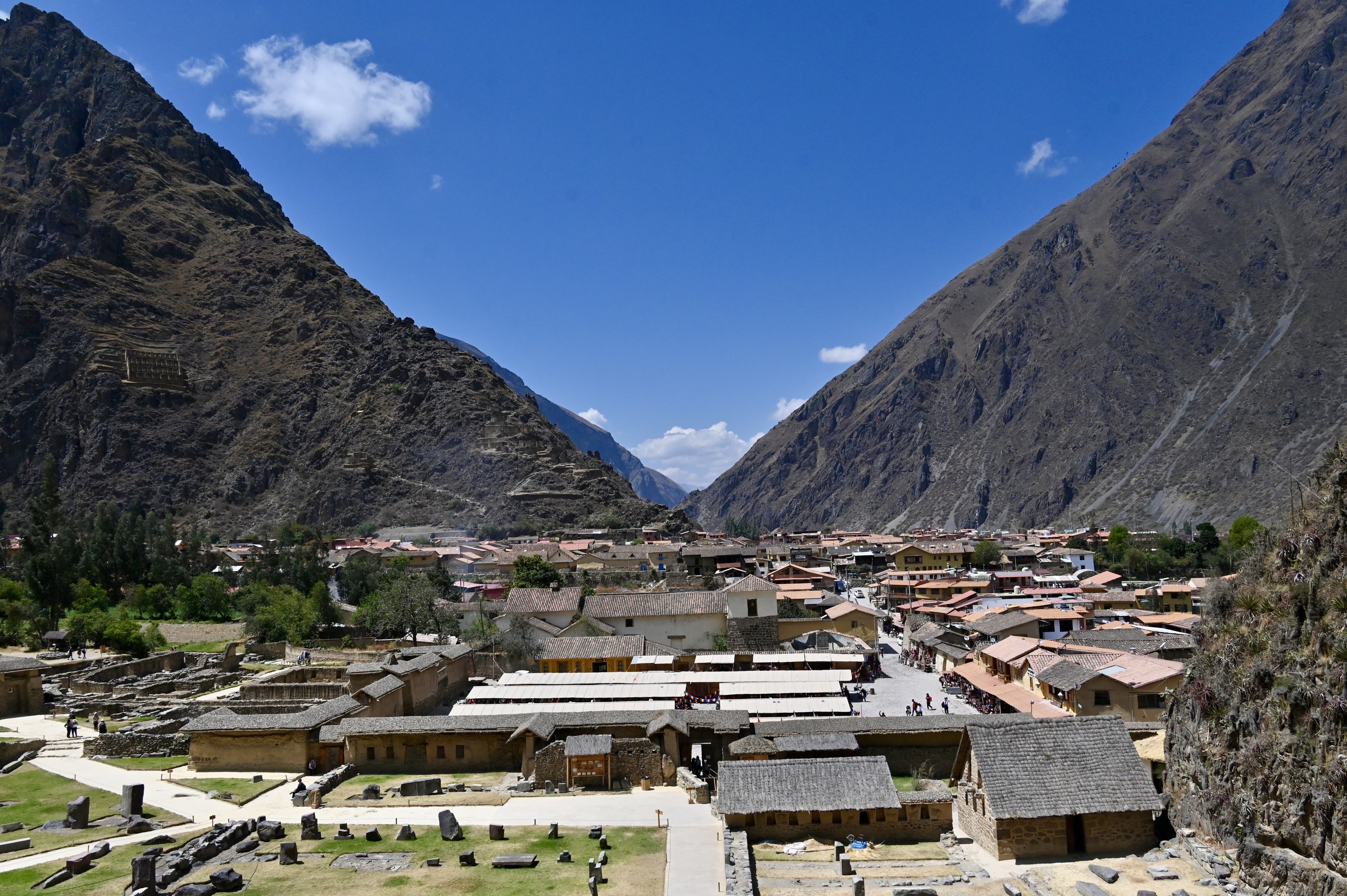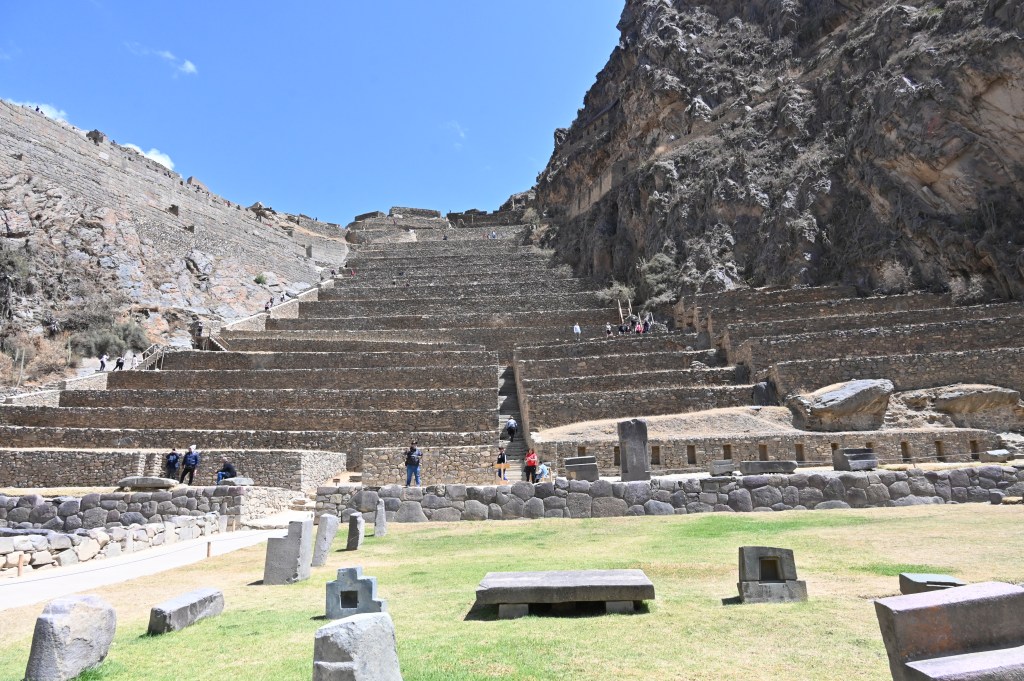 Ollantaytambo is magnificent. Terraces climb 300 feet up the side of a mountain, leading to a temple at the top. It’s a splendid example of Incan construction techniques, with massive stones carved to interlock so closely it’s impossible to slip a piece of paper between them. Window openings and doors are trapezoidal in shape to help withstand tremors. Across from the site, midway up a facing mountain, sit several Incan storehouses for grain, weapons, and other supplies.