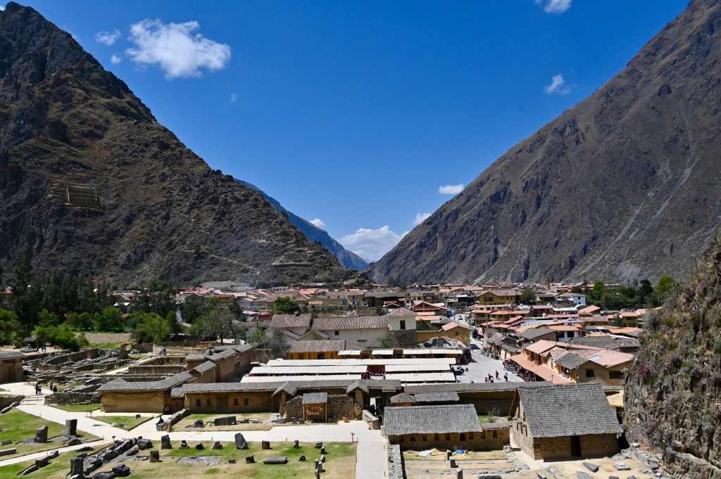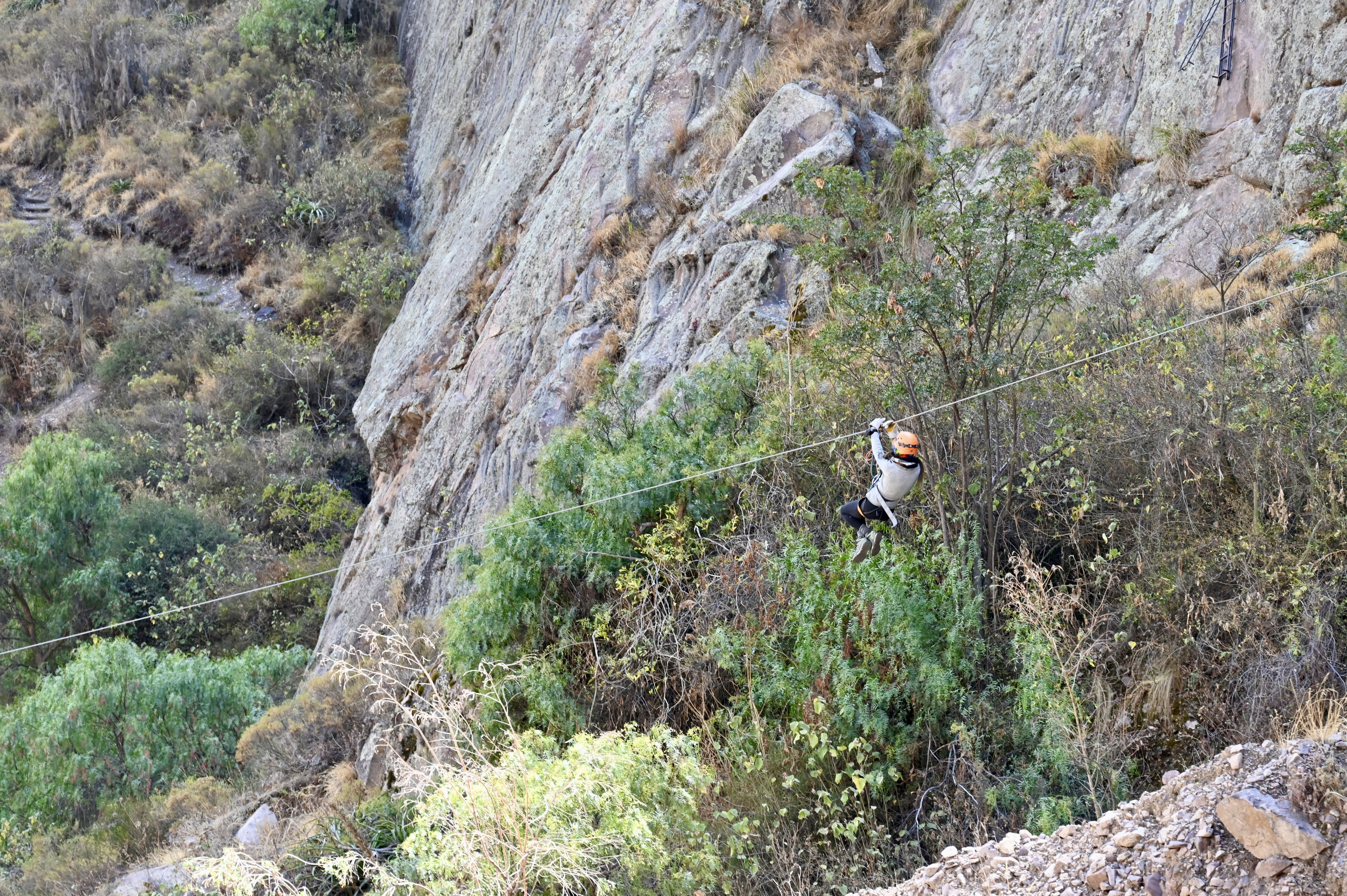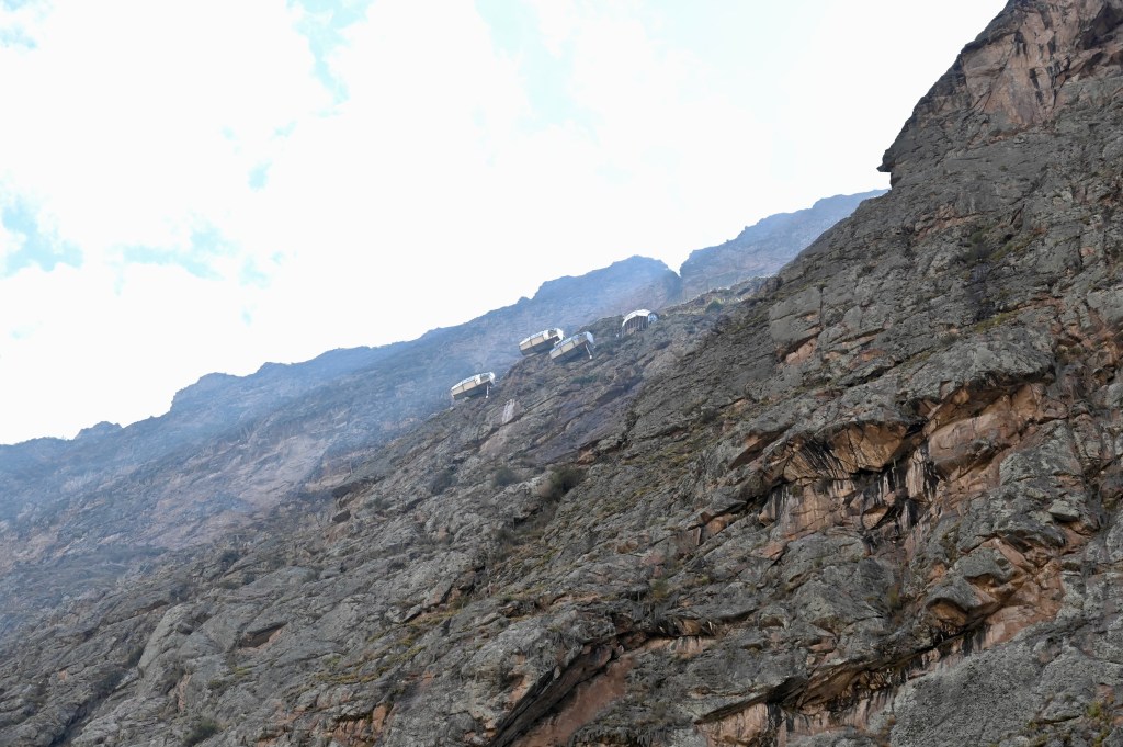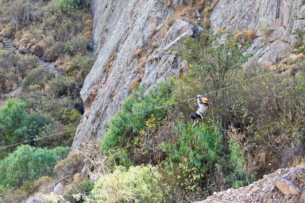 The drive to Ollantaytambo closely follows the river Urumbaba, which is the lifeline of the Sacred Valley. Along the way, we passed a “hotel” – basically a few metal “rooms” precariously perched on a nearly vertical escarpment, accessible only to rock climbers. The only way down: a zip line.