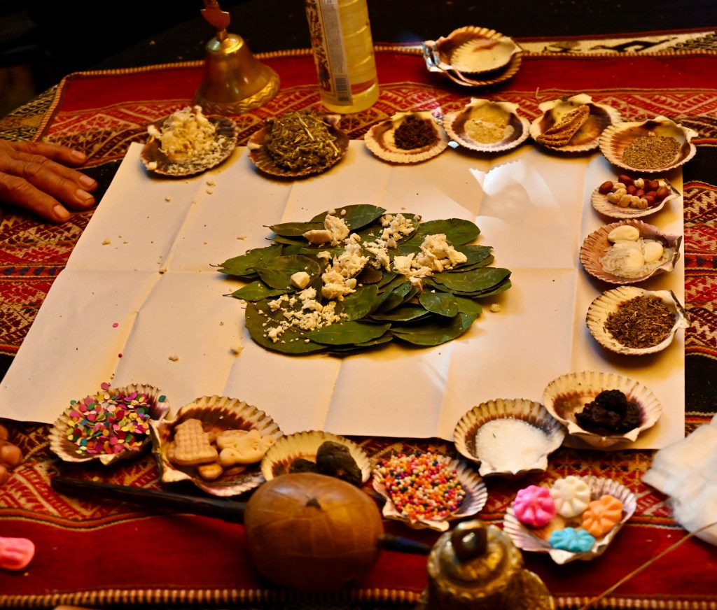 Next up was a visit to a weaving cooperative in the town of Chincheros, located high up in the Andes at around 12,500 feet. Before the demonstration, a charismatic shaman with a terrific sense of humor prepared an Offering to Pachamama (Mother Earth), consisting of coca leaves topped with dried beans, seeds, an herb similar to sage, raisins, nuts, cookies, and candies – he noted that Pachamama has a sweet tooth – over which he prayed rapidly in Quechua and Spanish.