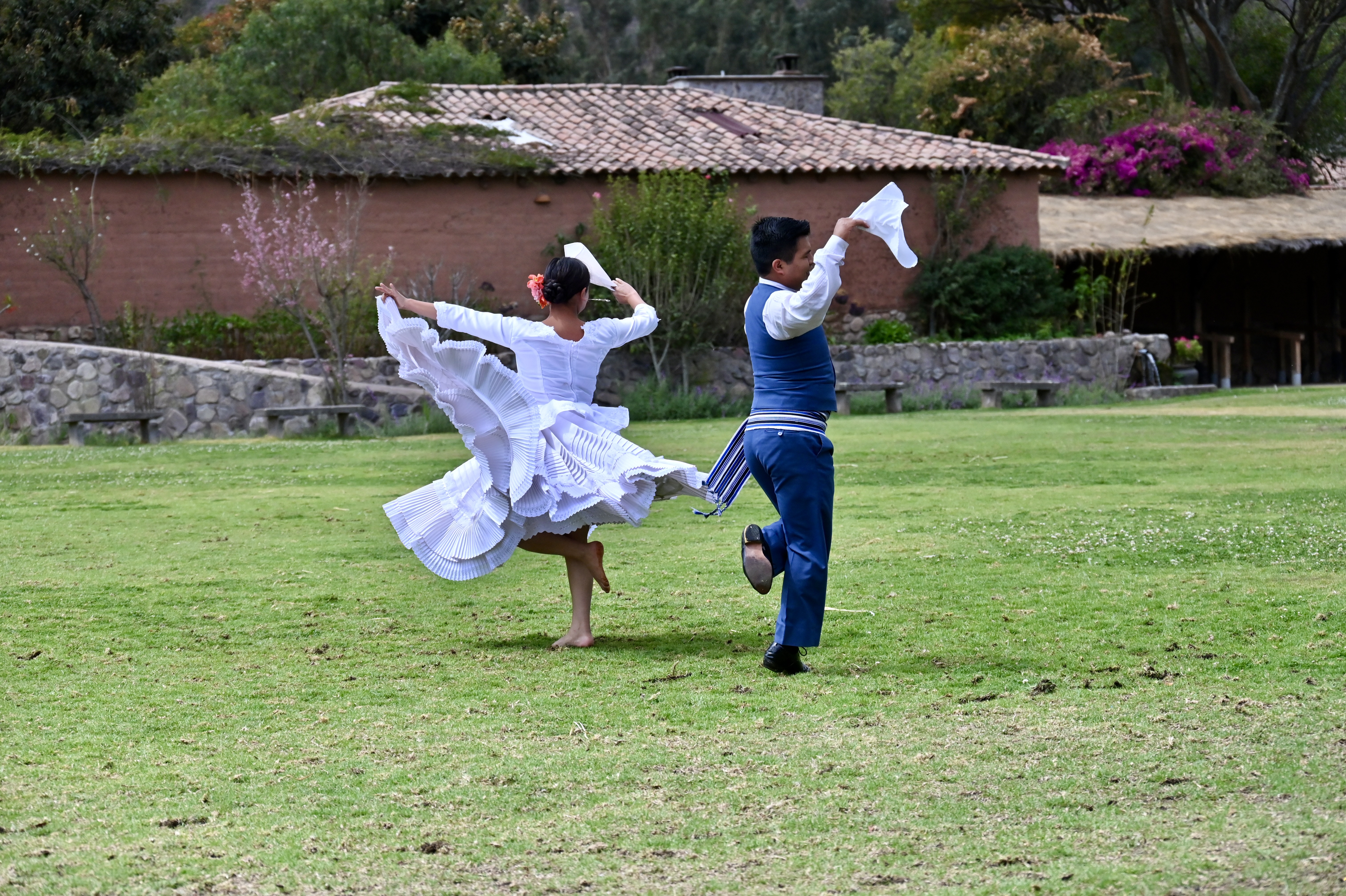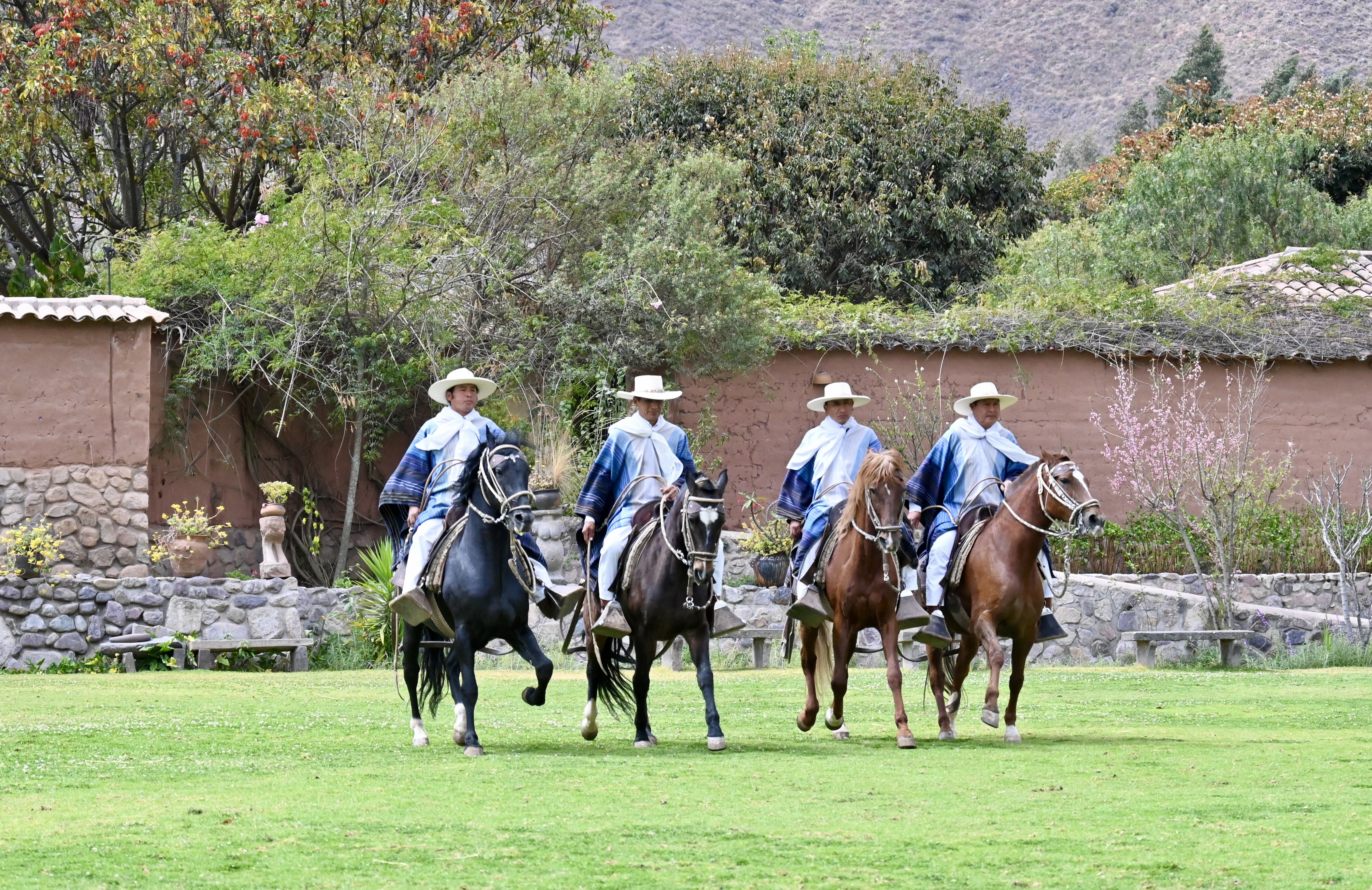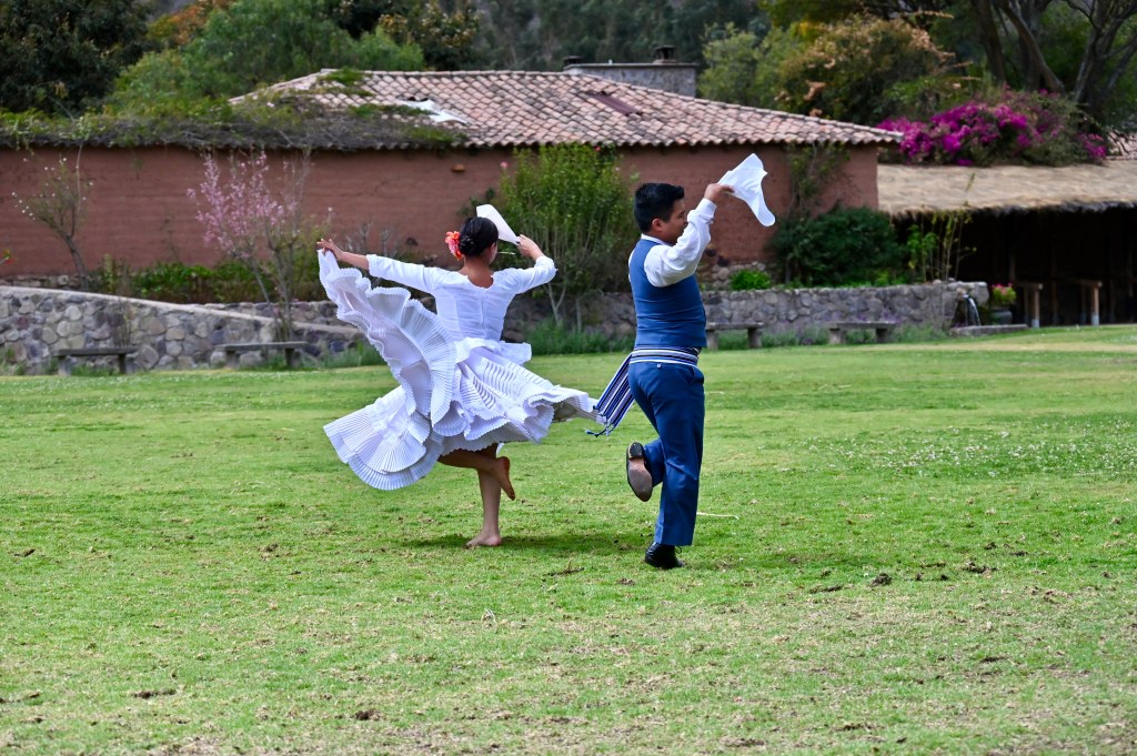 From Ollataytambo we made our way to a family-style restaurant called Wayra, where we enjoyed fresh fruits, different kinds of roast potatoes, vegetable and cheese empanadas, sweet potato-pumpkin ravioli, broiled trout, Incan corn with kernels four times as large as the corn we grow in the US, and a series of desserts, blithely violating one of the key maxims for avoiding altitude sickness: eat light. (For the true carnivores, there was pork and beef heart skewers.) During lunch, four men rode horses in intricately choreographed patterns, followed by a young woman and man performing a traditional Peruvian courtship dance.