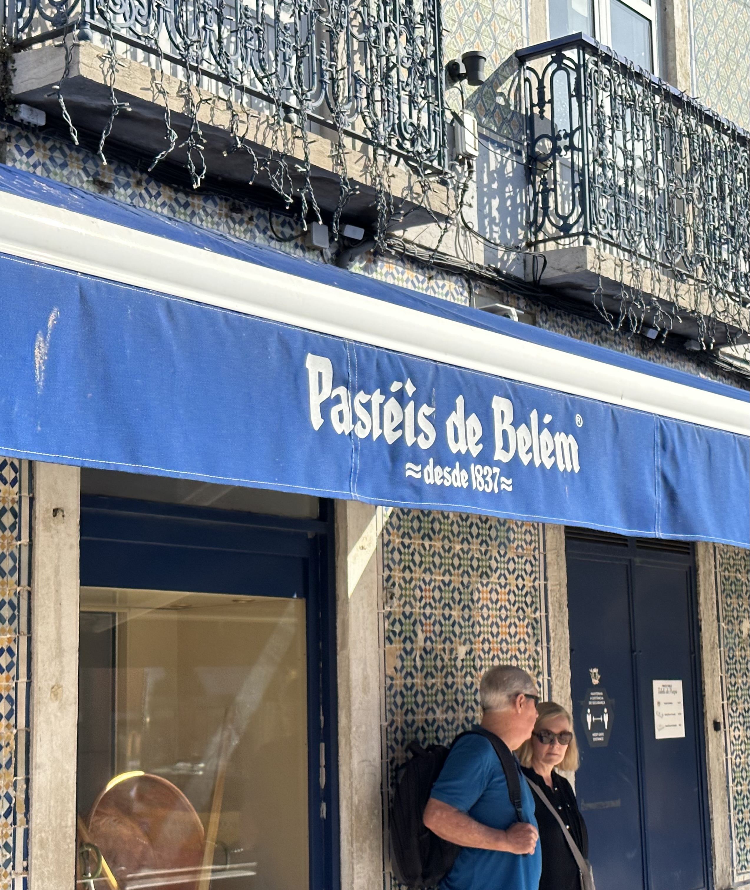 Next up: a wine bar where we had olives (Portugal has phenomenal olives, no debate possible), cheese, and, for the meat eaters, thinly sliced sausage, accompanied by a white and a red wine. (It was 5:00 somewhere, just not by us.) How to top that? Round 4 was, of course, pastéis de nata, accompanied by decidedly non-alcoholic (and for me, non-caffeinated) espresso. I couldn’t answer the bell for the pastéis, having exhausted my monthly custard quotient this morning. I’ll have to train harder for the next Jeff v. food experience.