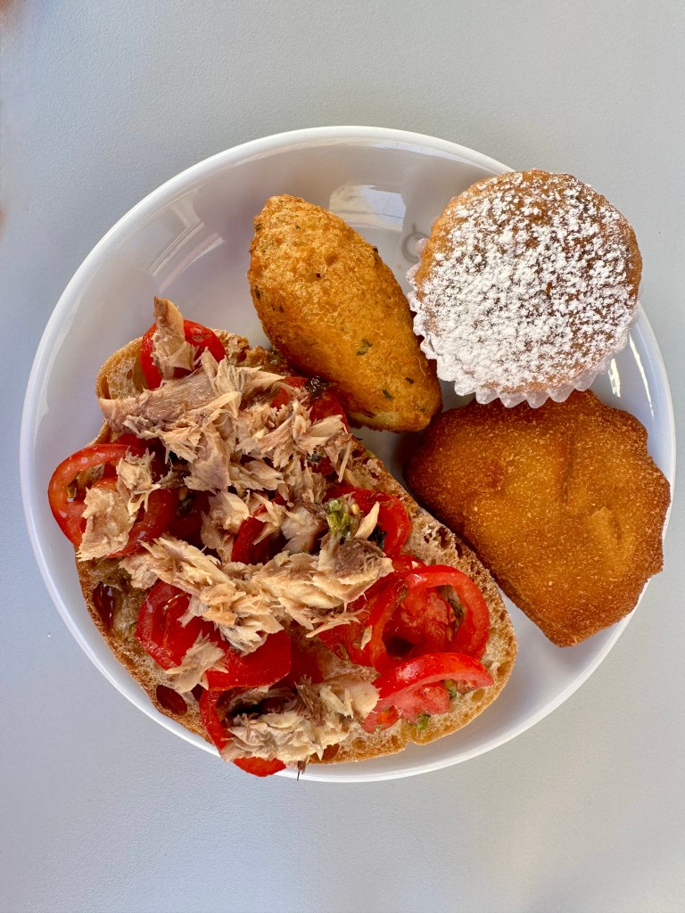 After wandering through a small market (rather tame compared to the bustle and aromas of markets I’ve written about in Ecuador, Mumbai, and Barcelona) we stopped at an establishment named `A da Bia and feasted on fried cod croquettes, fried shrimp croquettes, zucchini/nut mini-muffins (I baked rather than fried), a bruschetta-like creation with mackerel (ditto), and beer (definitely not fried). Pretty, pretty, pretty good, to quote Larry David.