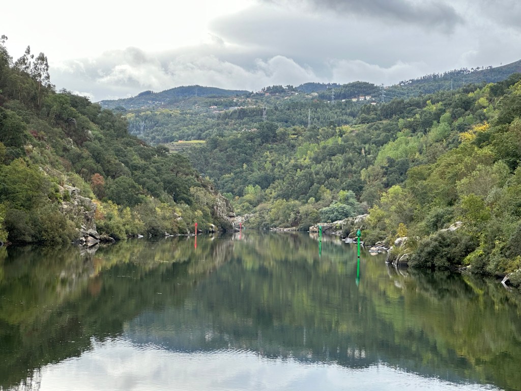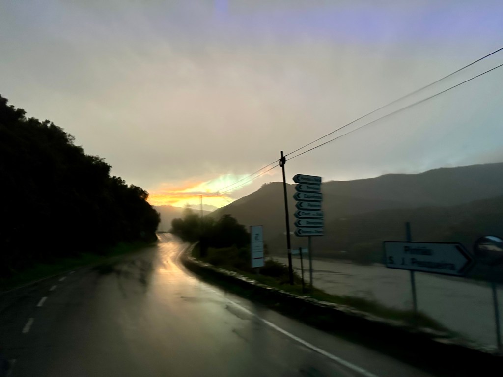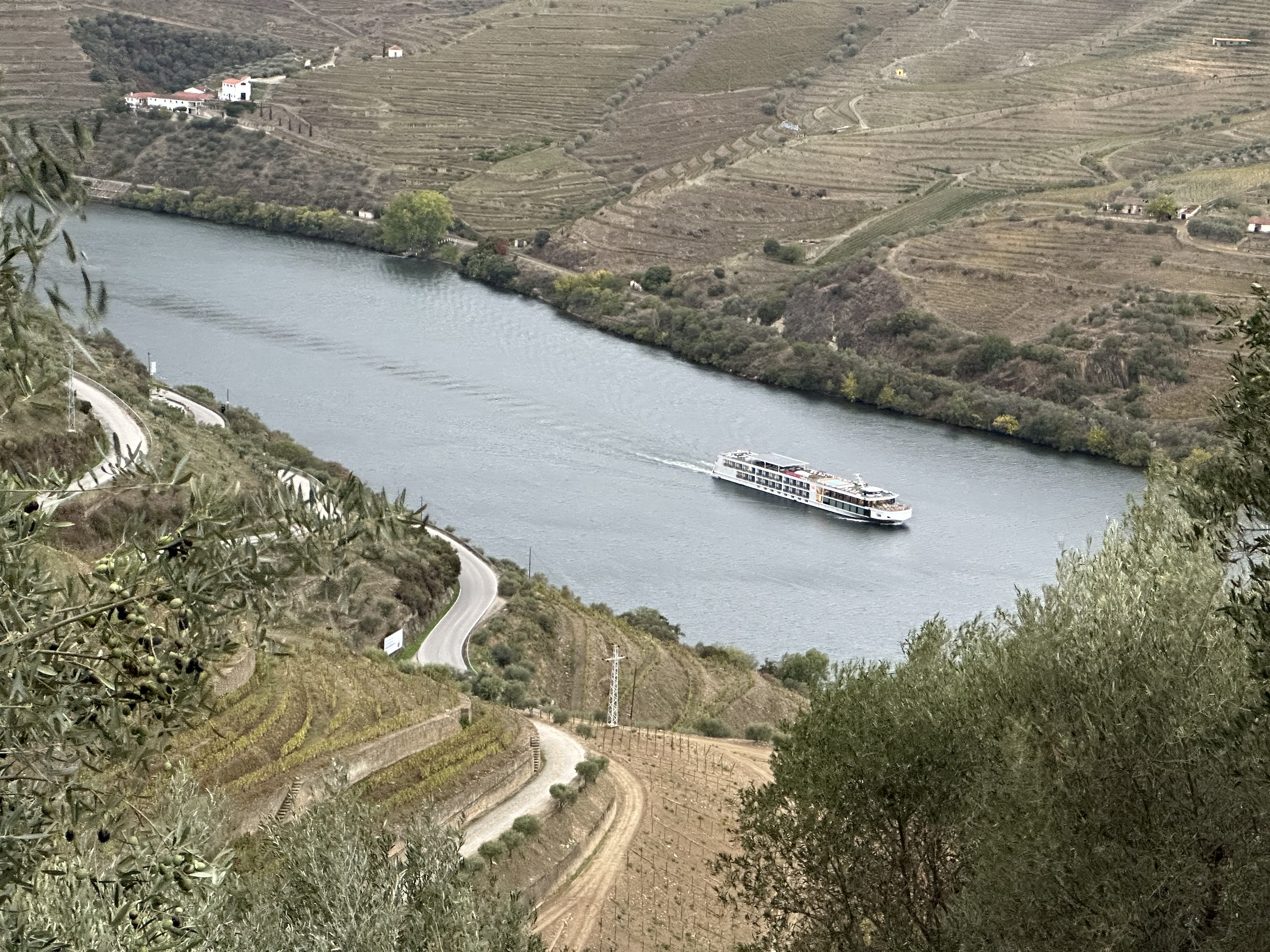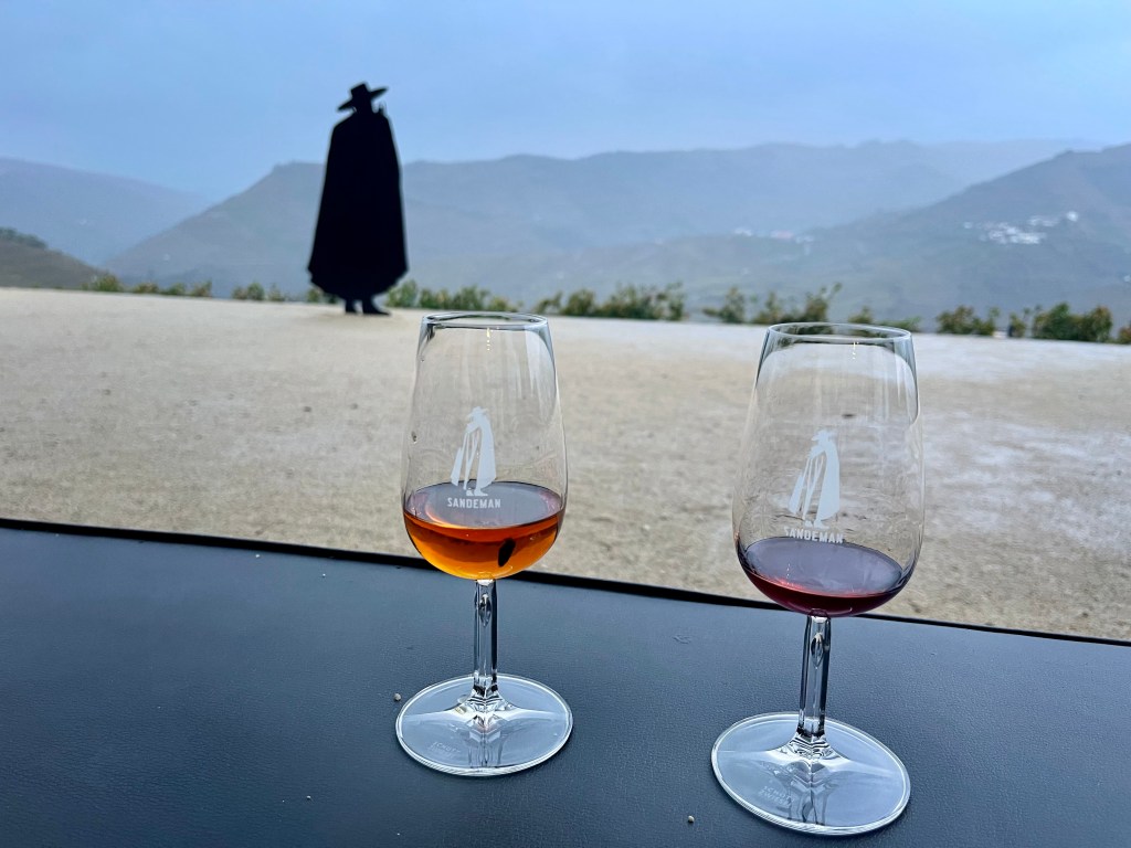 Our second stop, the Sandemans Port distillery, sits high atop the river at the end of a sharply twisting, narrow road with a mountain to the right and a sheer drop to the river on the left. Less fatalistic passengers than I made various gasps and eeks of concern on the ascent, but we arrived without incident. The distillery tour was nothing special, but the Port was a nice counter to the chilly drizzle and the view was impressive. (As I said in a poorly-received aside, “any Port in a storm.”)