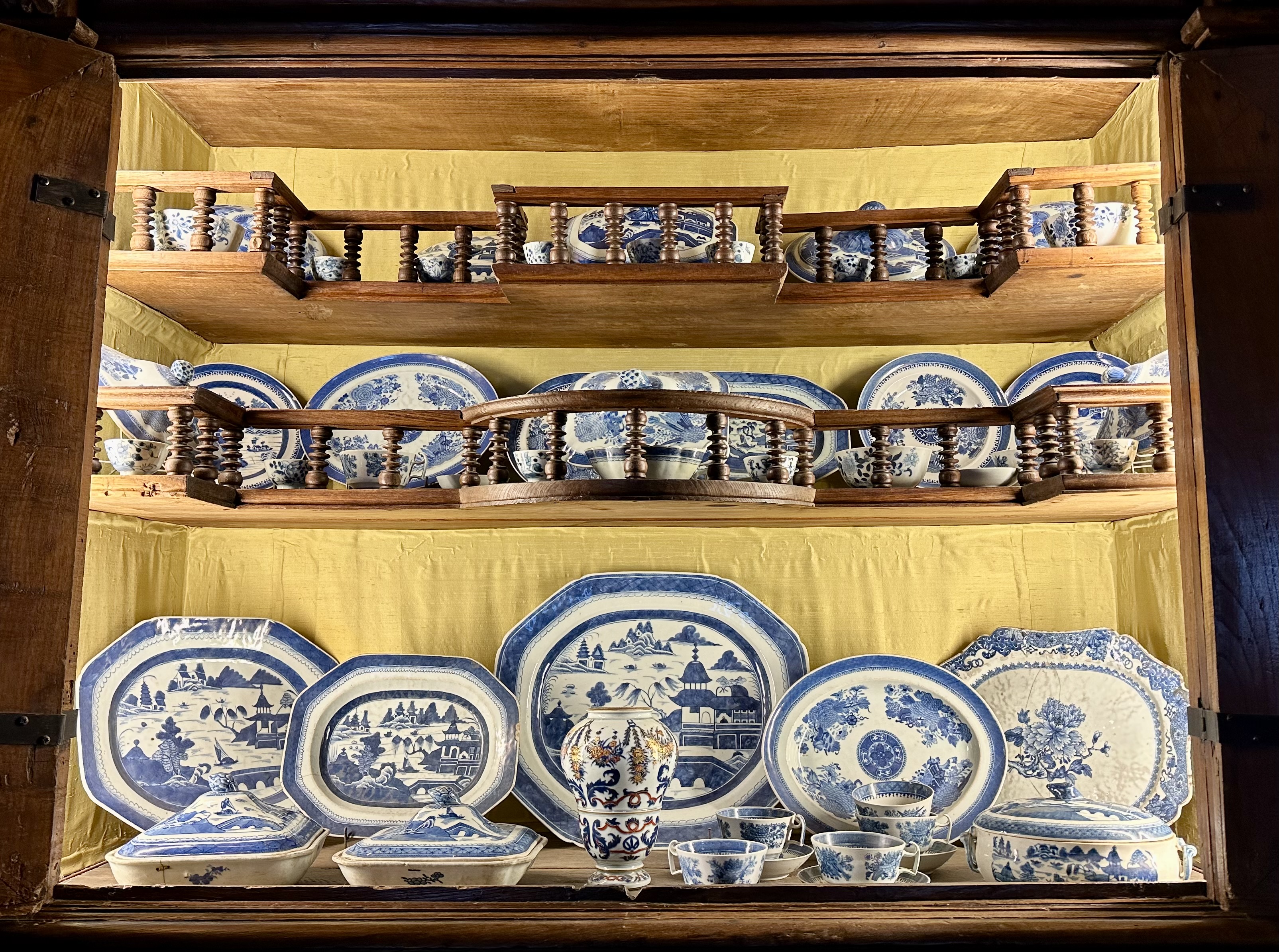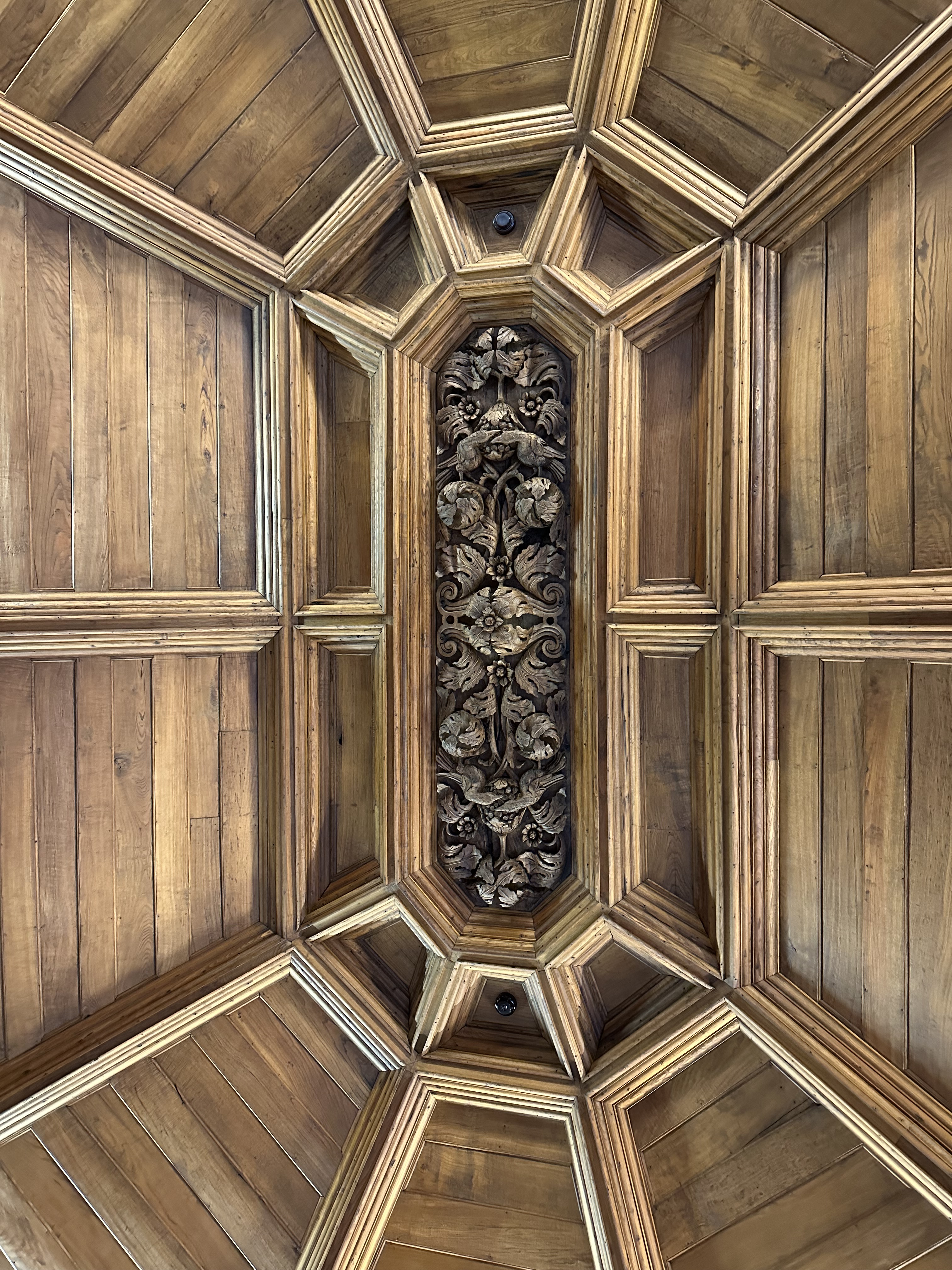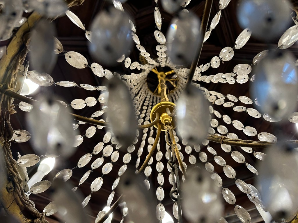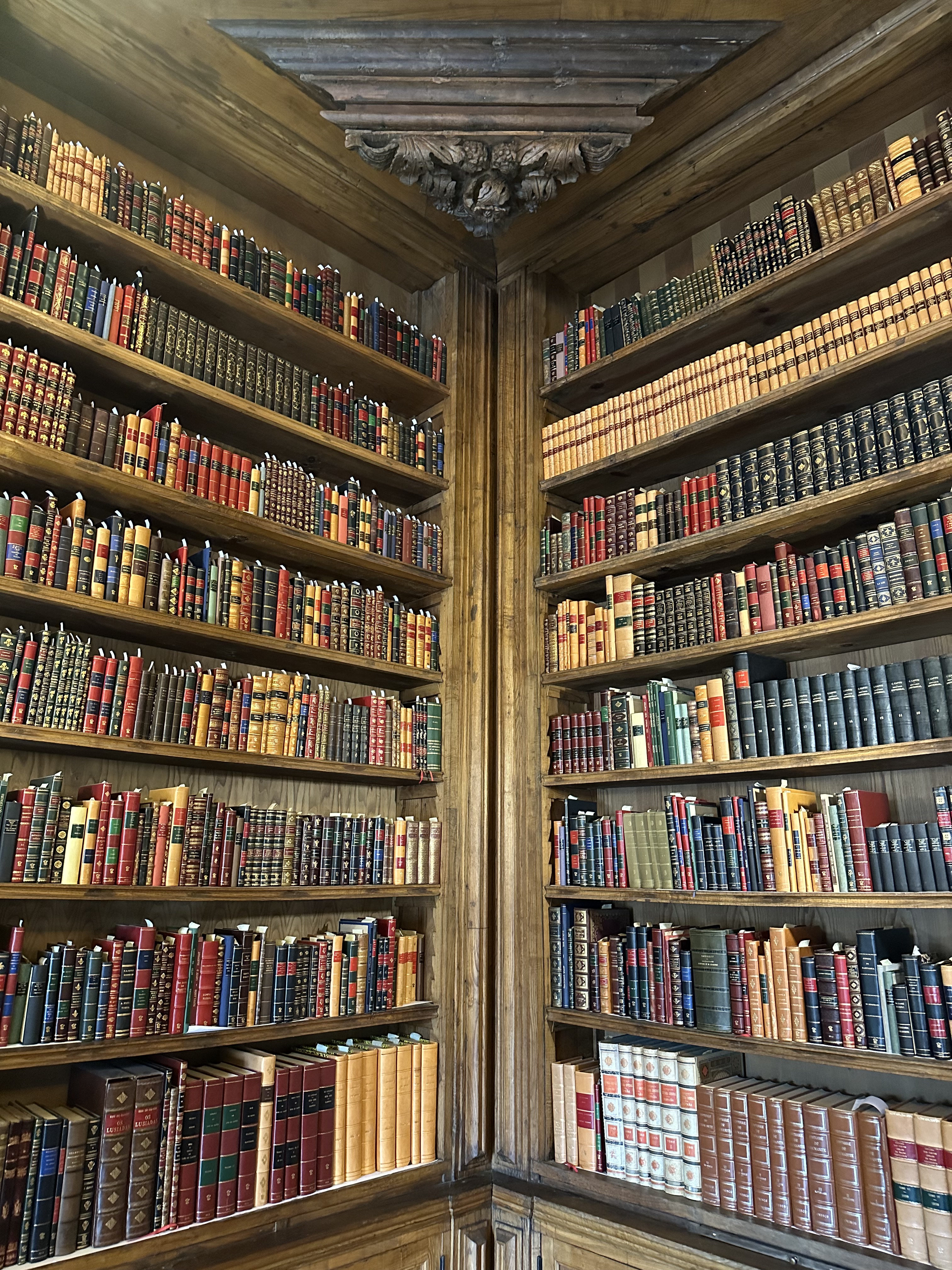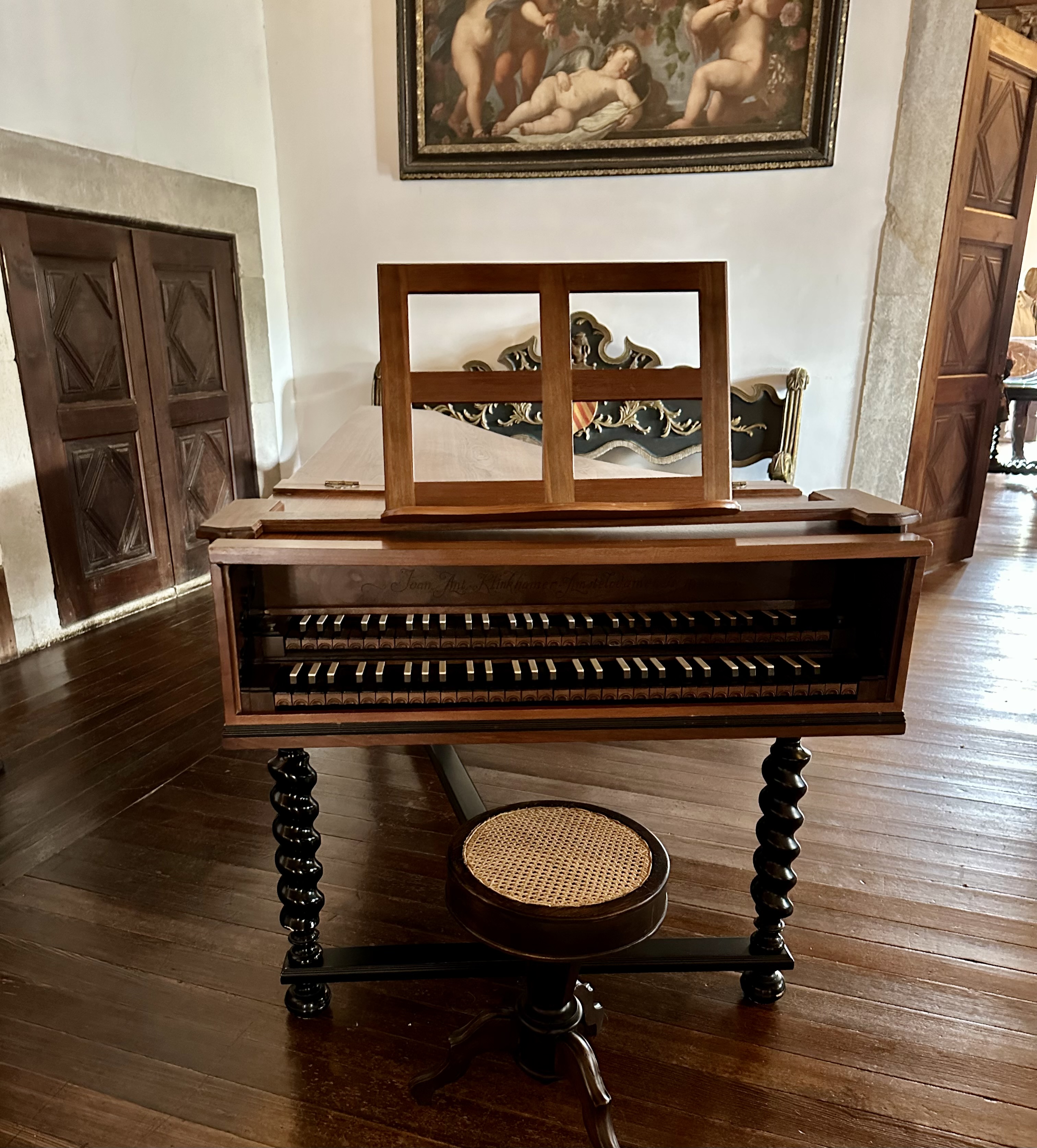 The Palace is fronted by tall trees and a reflecting pond, with rose gardens, manicured hedges, and a vineyard in back. Inside, dark wood, ornate ceilings, blue and white porcelain, and muted area rugs set an ostentatious but sterile tone. Although I didn’t find the palace homey, it has two saving graces: a gorgeous harpsichord and a library packed with quaint and curious volumes of forgotten lore, though no ravens.