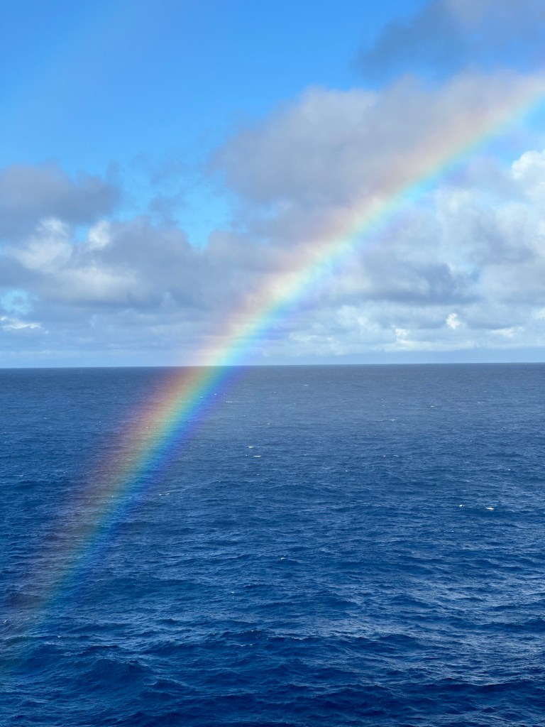 Let me close, on a literally sunny note, with a picture of this morning’s gorgeous sunrise and a beautiful rainbow seen as a brief afternoon shower passed by.