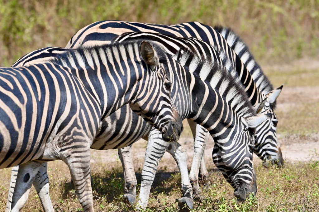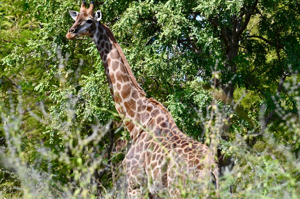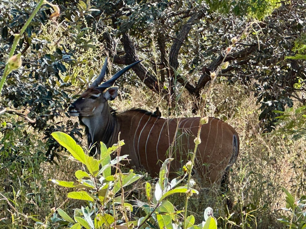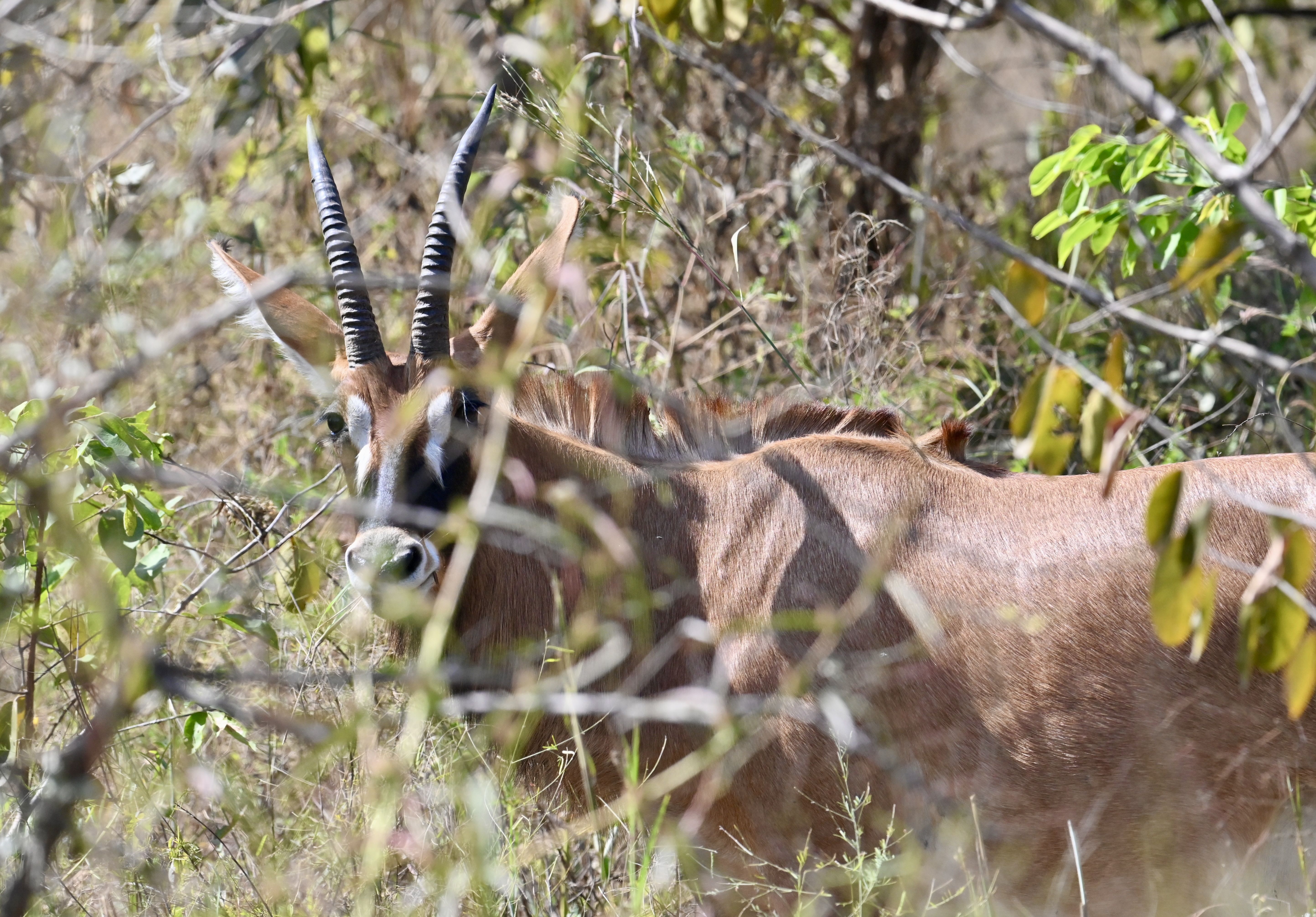 Our tour featured the “African massage”: jostling over sun-baked trails in safari trucks whose suspensions were distant memories. During our roughly 2-hour excursion, we saw families of zebras (smaller than I’d thought), giraffes (taller than they appear in zoos and quite graceful), three kinds of antelopes (eland, water bucks, and roan), colobus monkeys, and bush pigs. [Question: if you crossed an eland with a musk ox, would the offspring be Eland Musk?]