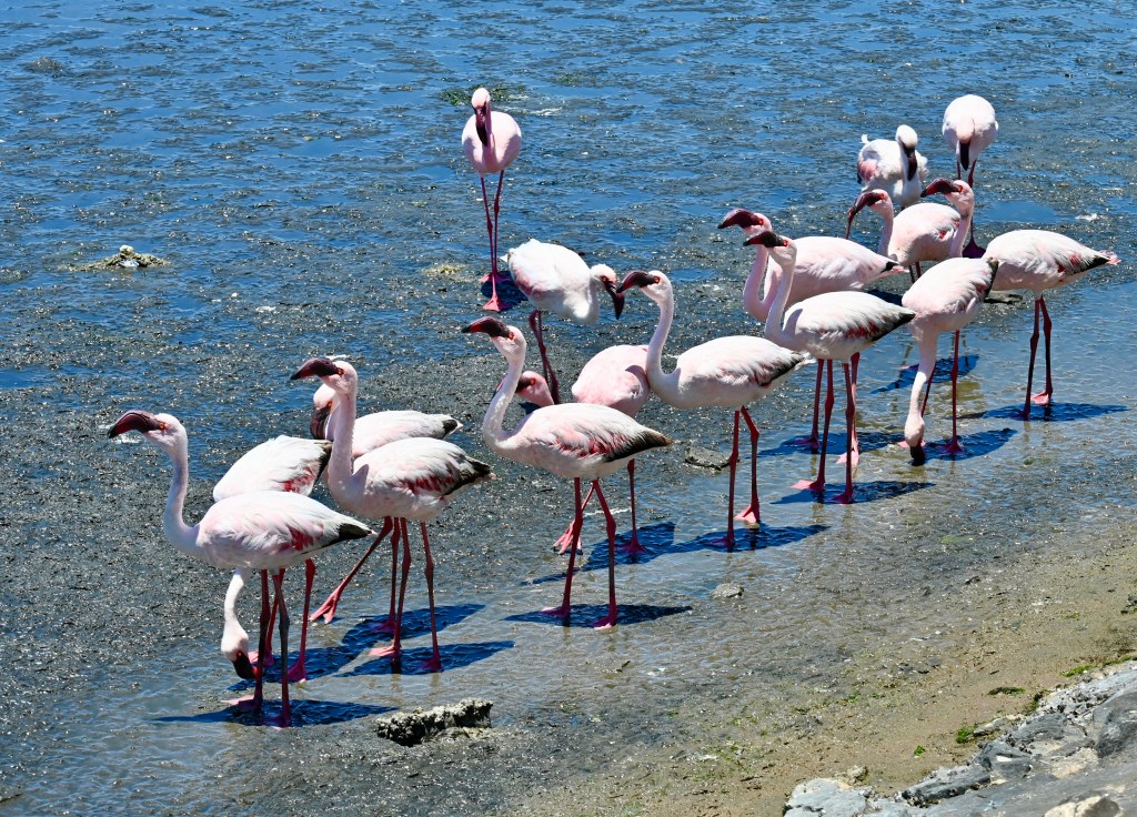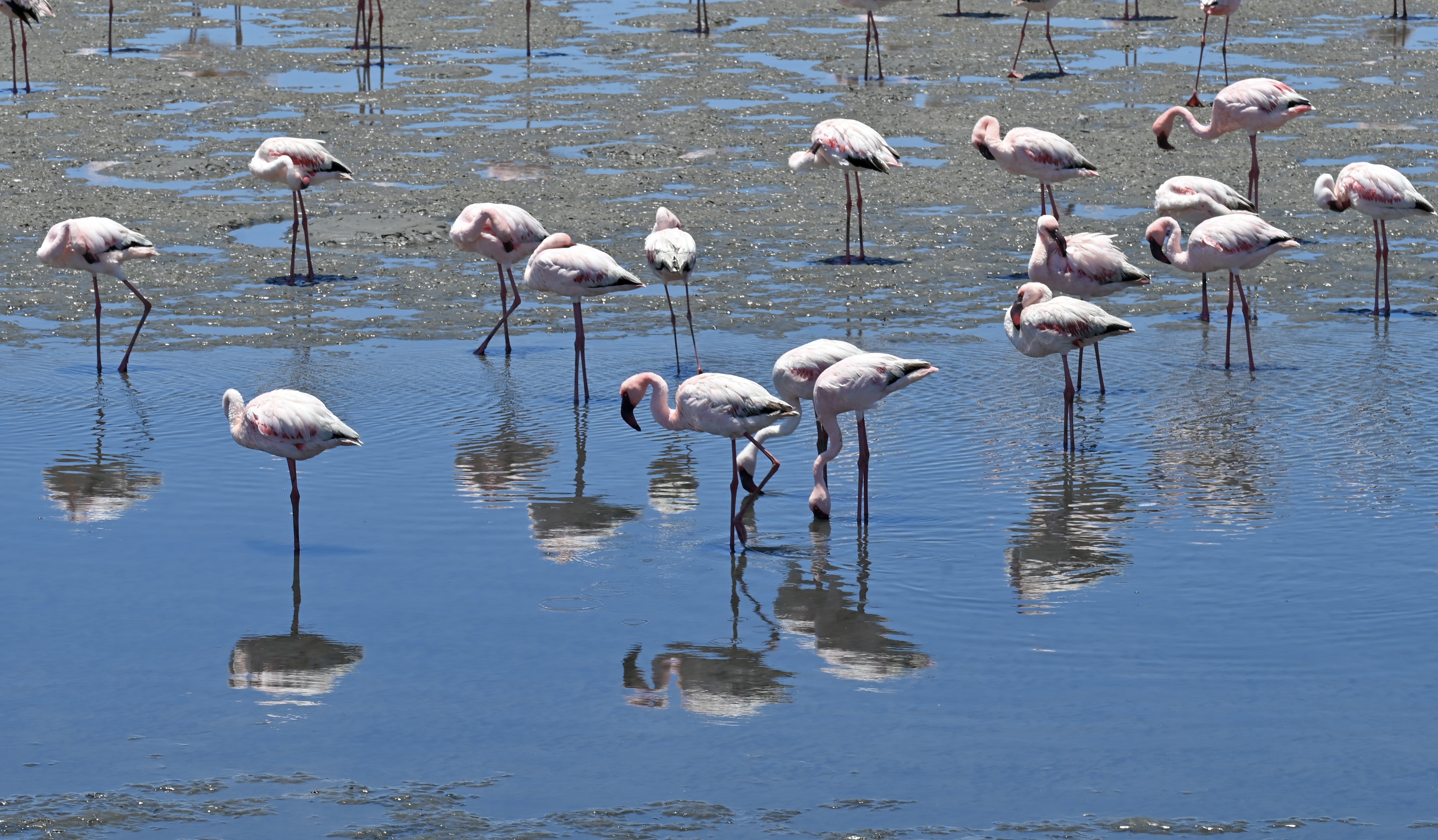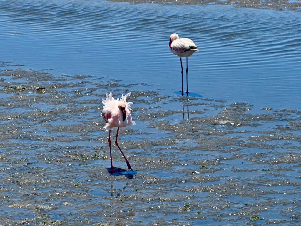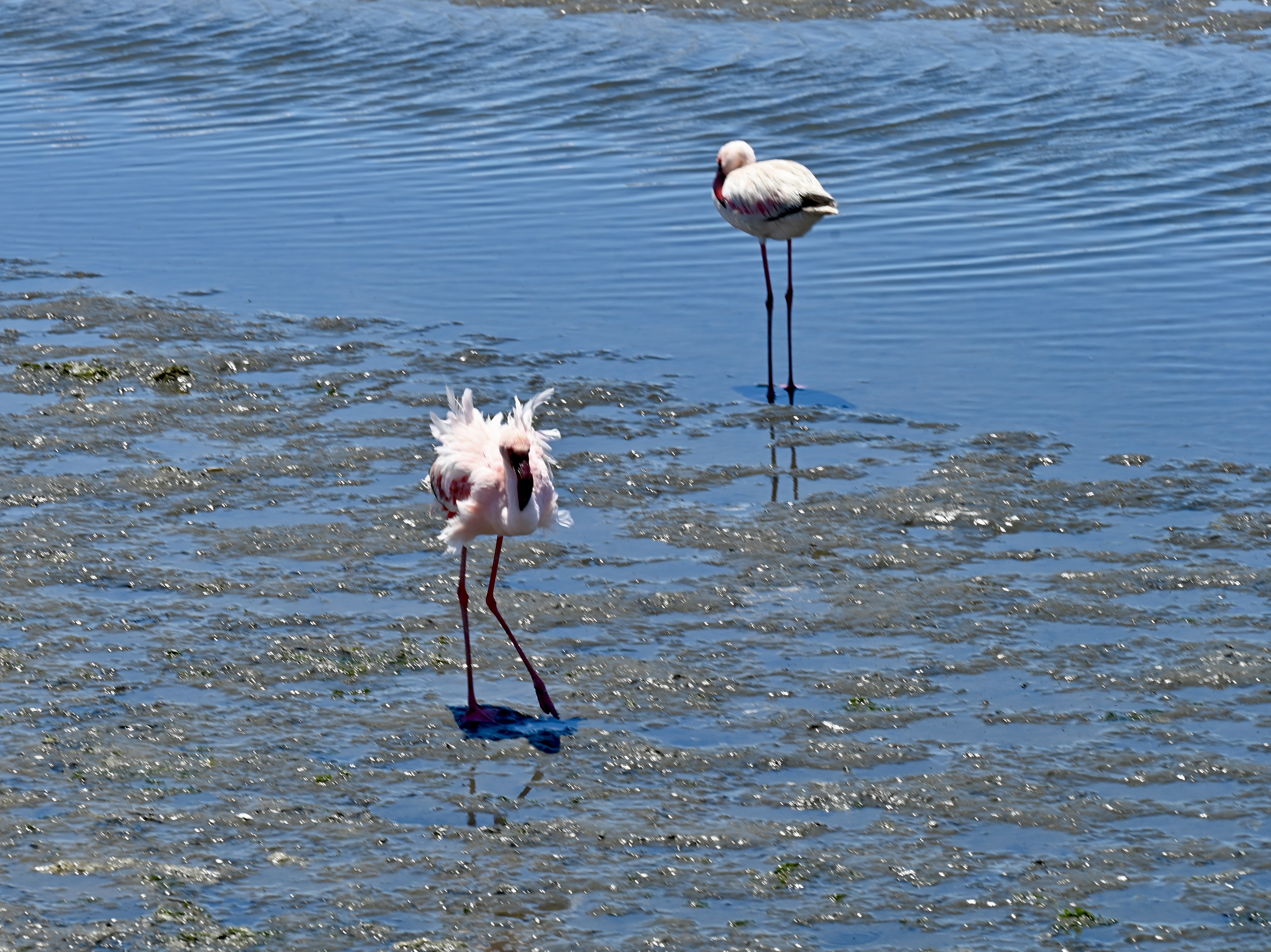 Our final stop was a lagoon where hundreds of flamingos sieved the sand for tiny crustaceans, algae, and other delicacies. Graceful from a distance, up close they seem almost reptilian. In flight, they resemble pterodactyls, and in the afternoon sun, their ungainly bodies cast fascinating, leaf-shaped shadows. (This part of Namibia also has ostriches, springboks, and oryxes, which my brother saw on his tour, as well as baboons, which none of us saw.)
