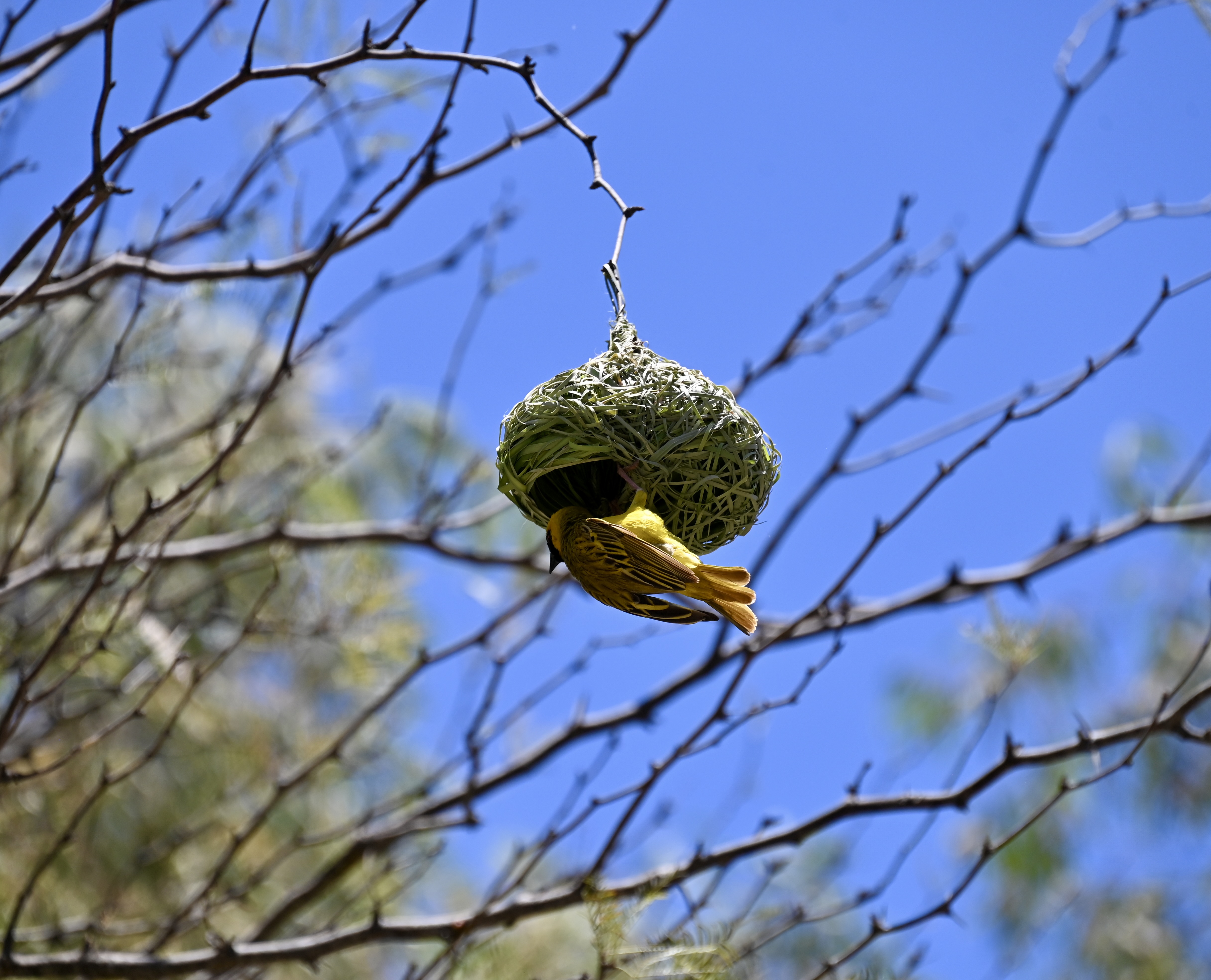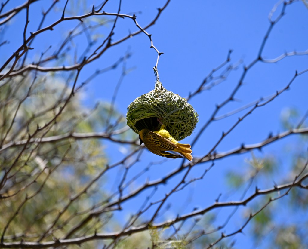 Guests who stay at the lodge are invited to participate in night-time scorpion hunts, but all the daytime denizens were stingless: Gorgeous chickens with Art Deco feathers strutted about, guinea fowls with pinpricked black and white plumage skittered around, brilliant green parakeets flitted above, and neon yellow weaverbirds darted in and out of their globular nests.