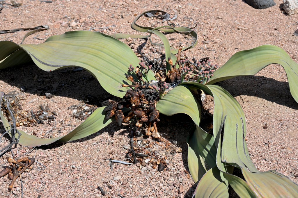 Botanists regard Welwitschia as a missing link between gymnosperms (seed-bearing plants) and angiosperms (flowering plants). In Welwitschia, the females are seed-bearing and the males flower. The plants live for centuries; the ones we saw were an impressive 500 years old, but the oldest one on record lived for 1500 years.