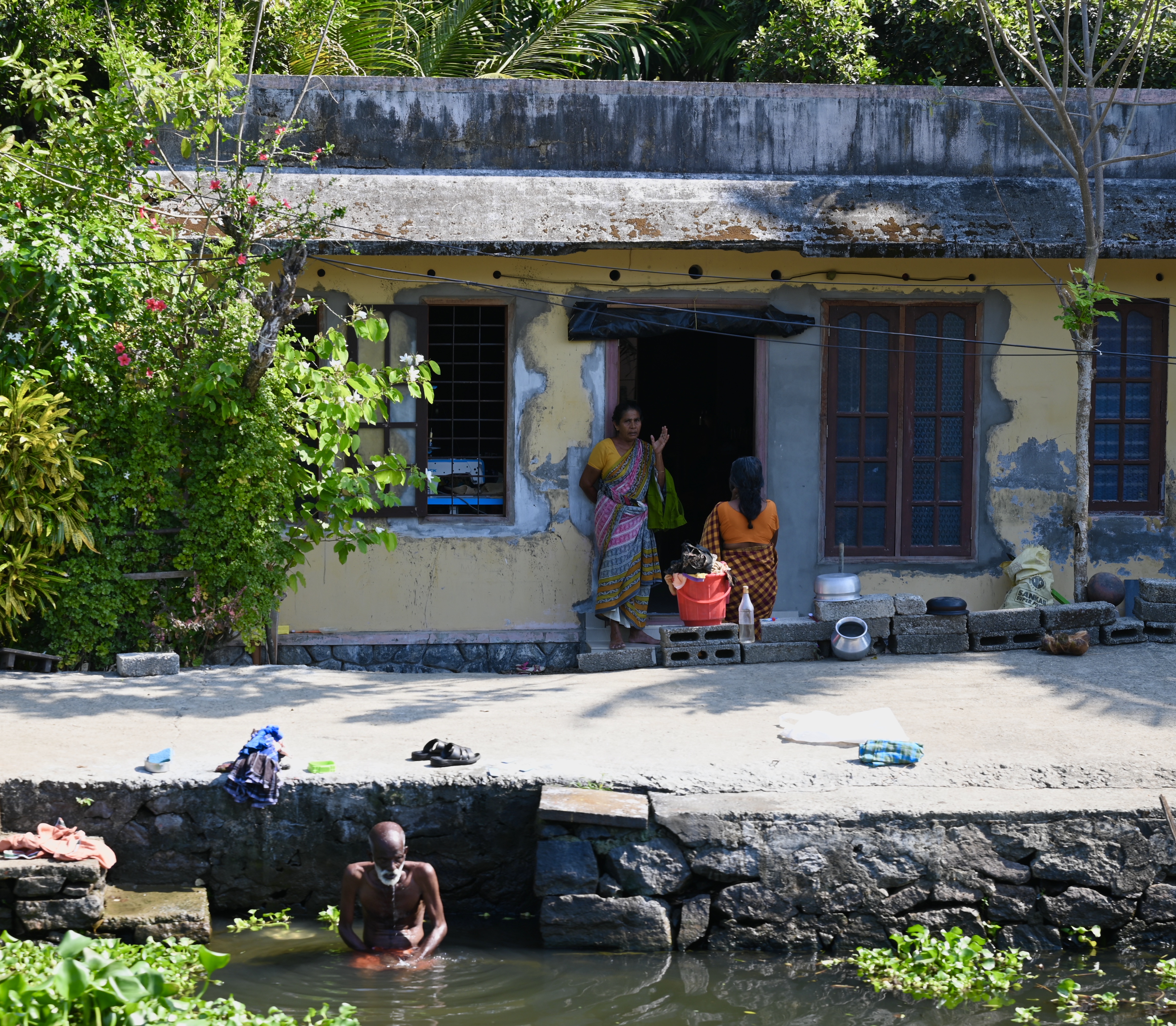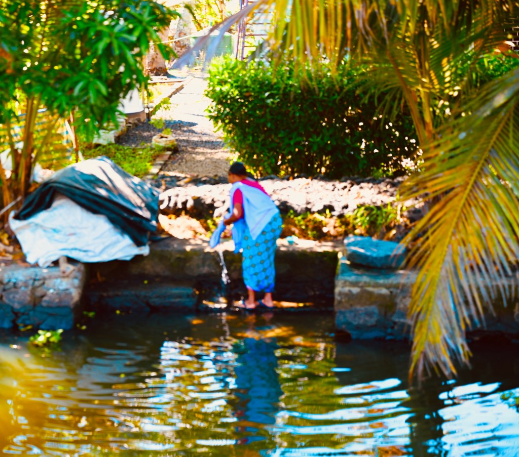 Our bus delivered us to an open-air sightseeing boat, which meandered past elegant houseboats (rentable for $250 a night), waterside dwellings ranging from one room hovels to three story villas, women washing clothes in the waterway as their great-great-grandmothers must have done (I saw no enlightened men pitching in), and men bathing in the river.