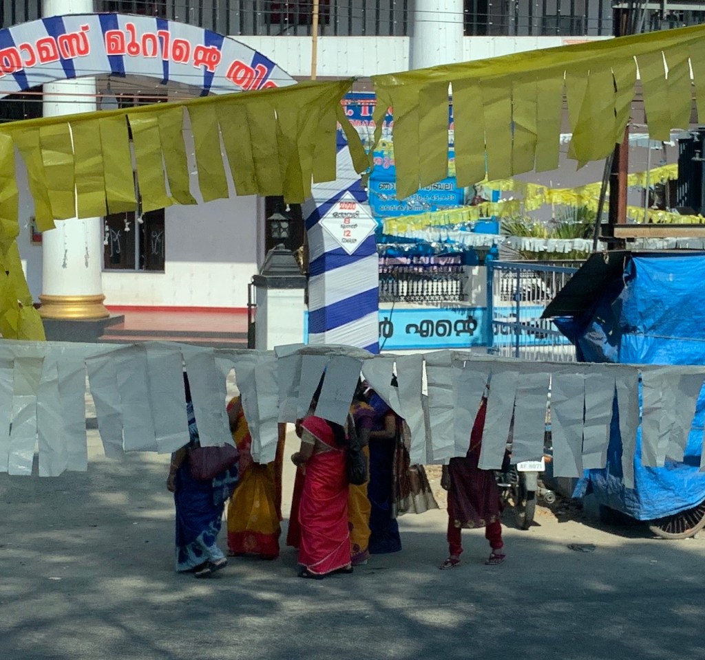 The two-hour bus ride from Cochin to Alapuzzha (a network of waterways winding through lush surroundings) revealed a fascinating slice of a very different life: kids playing volleyball, cricket, and soccer (not simultaneously) on dirt fields; dilapidated stands selling fruits and vegetables, spices, and seafood; battalions of scooters and tuk tuks (motorized rickshaws); temples honoring Shiva, graceful mosques, and gleaming white churches; and an inordinate number of bakeries, medical supply stores, and hospitals (I’m sure there’s some relation there, but I prefer not to think too hard about it, being fond of baked good myself). The picture above (taken with my iPhone from the bus window) shows women gathering at a festival of some kind; I love the way the colored flags cover the women’s heads.