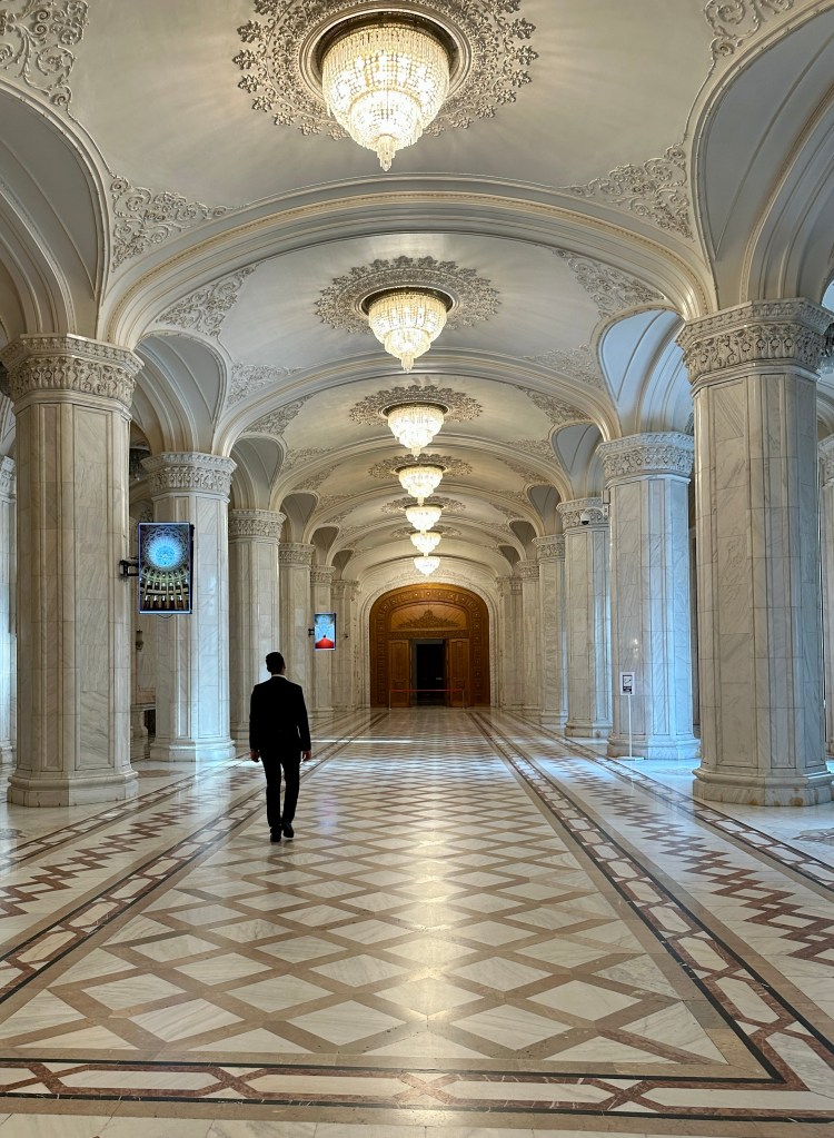 Our first evening, Tauck brought us to dinner at the Palace of Parliament, a megomaniacally massive building begun by Ceausescu and finished after his execution. Depending on whom you believe, it’s either the heaviest or second-heaviest building in the world, though I couldn’t tell you who makes those determinations. Inside, all is marble, carved wood, and luxurious carpets, 100 percent Romanian-sourced at Ceausescu’s demand. To comply with this requirement, the architects even imported silkworms from China and waited for them to produce raw material for the carpets and drapes in their new home.