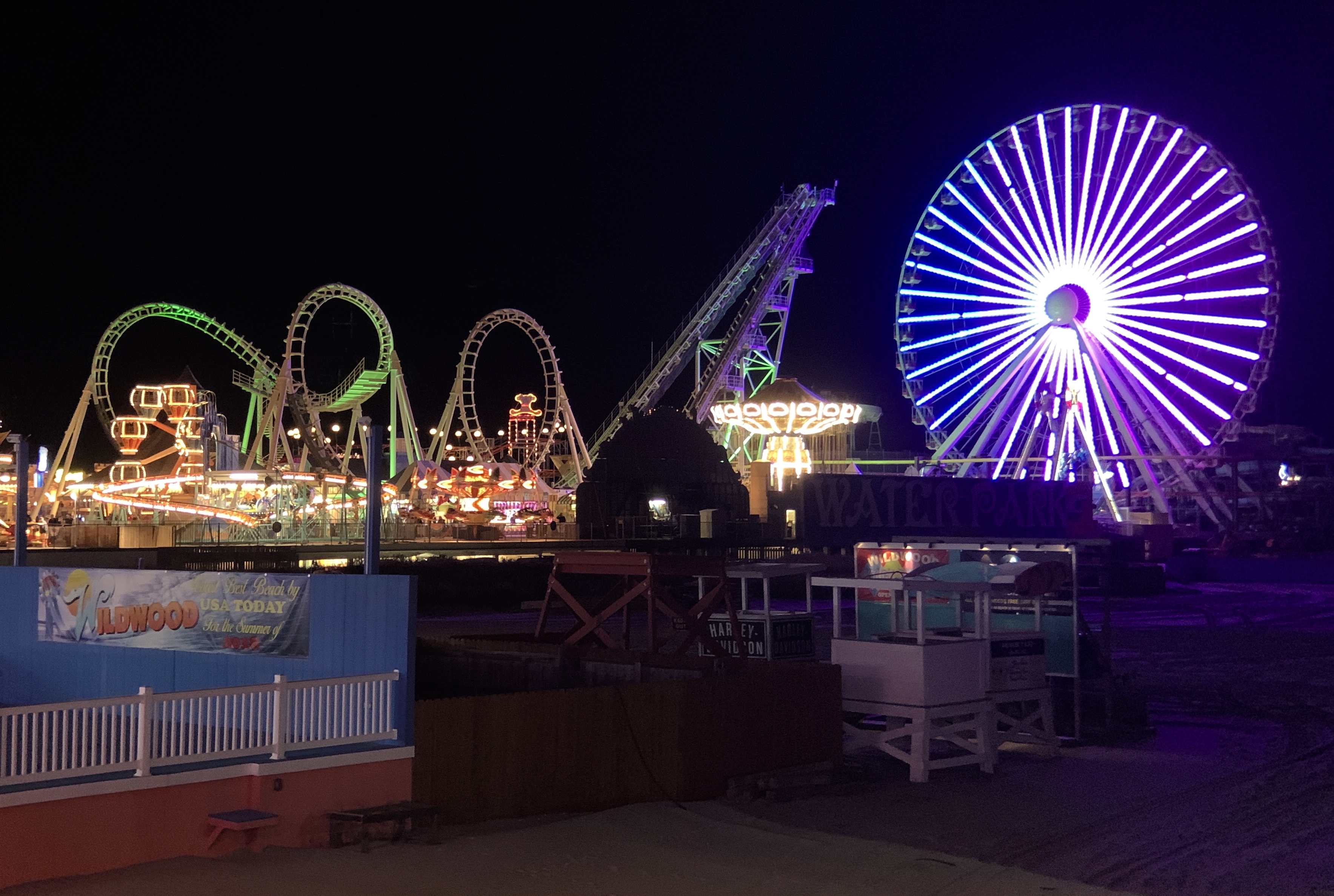Bordering the beach for two-and-a-half miles, Wildwood’s boardwalk includes three piers with rides and two water parks, although only one pier was open this late in the season.