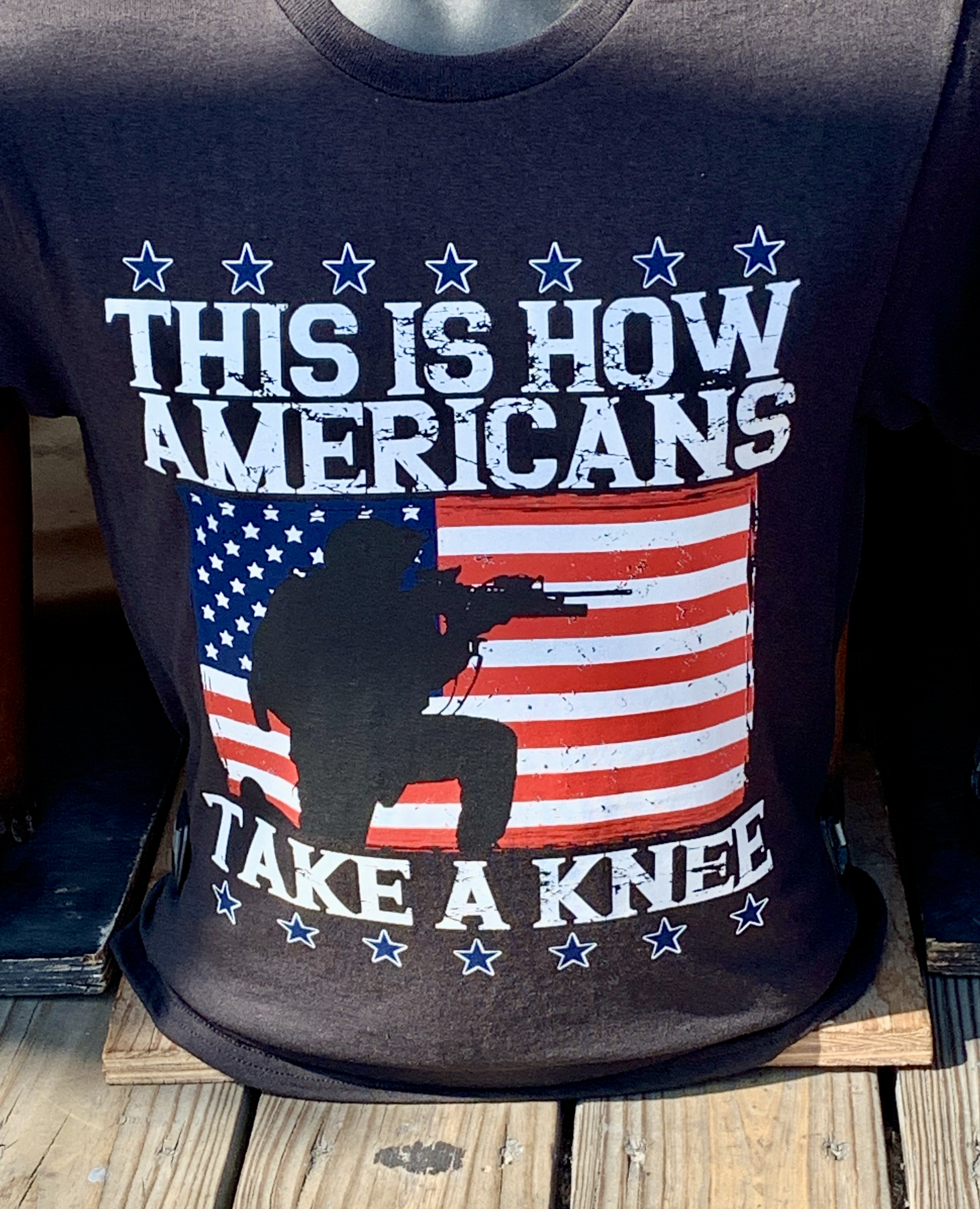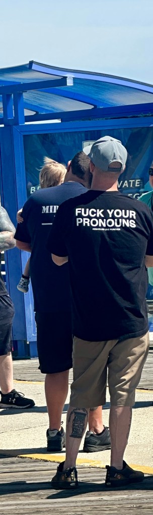 Many stores on the boardwalk, obeying the capitalist imperative, sell tees and sweats emblazoned with hyper-macho jingoistic right-wing bullshit, to use the technical term. The slogans and pictures on the clothing spew hate and glorify violence, ignorance, and intolerance.