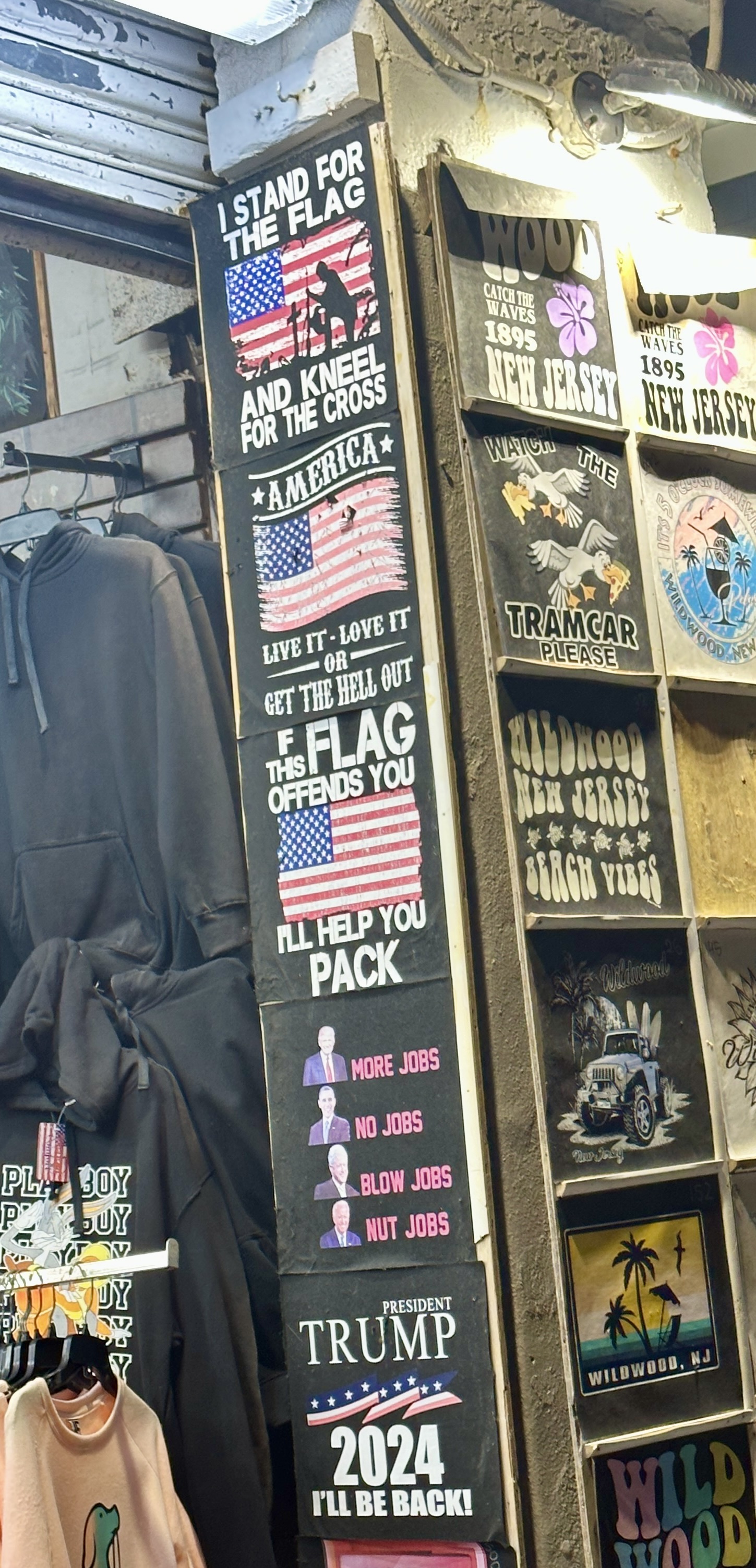 Until Trump announced his campaign for President, the most common tee-shirt designs on the boardwalk – since time immemorial – were “Friends Don’t Let Friends Drive Fords” and “Friends Don’t Let Friends Drive Chevys.” Since then, the slogans have turned increasingly vitriolic.