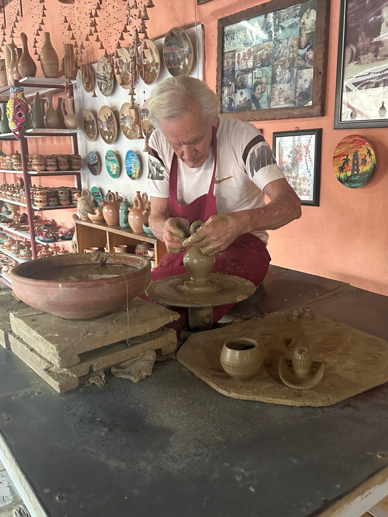 We stopped at dueling pottery workshops, owned by two brothers who apparently no longer talk to each other. I was amazed watching one of the brothers, who I believe is well into his 80s, throw beautiful pots, pitchers, and cups on his ancient wheel.