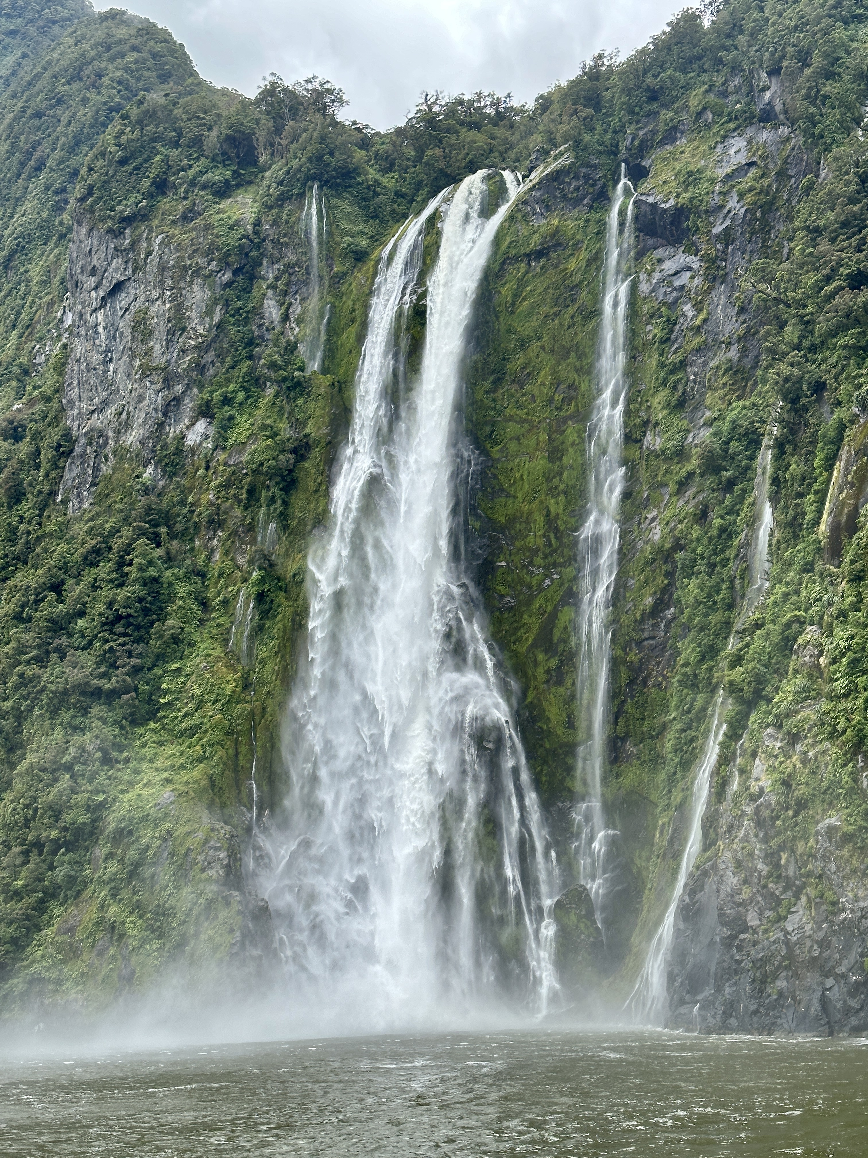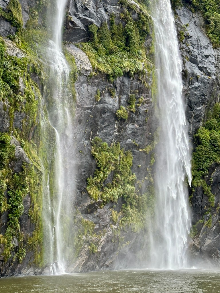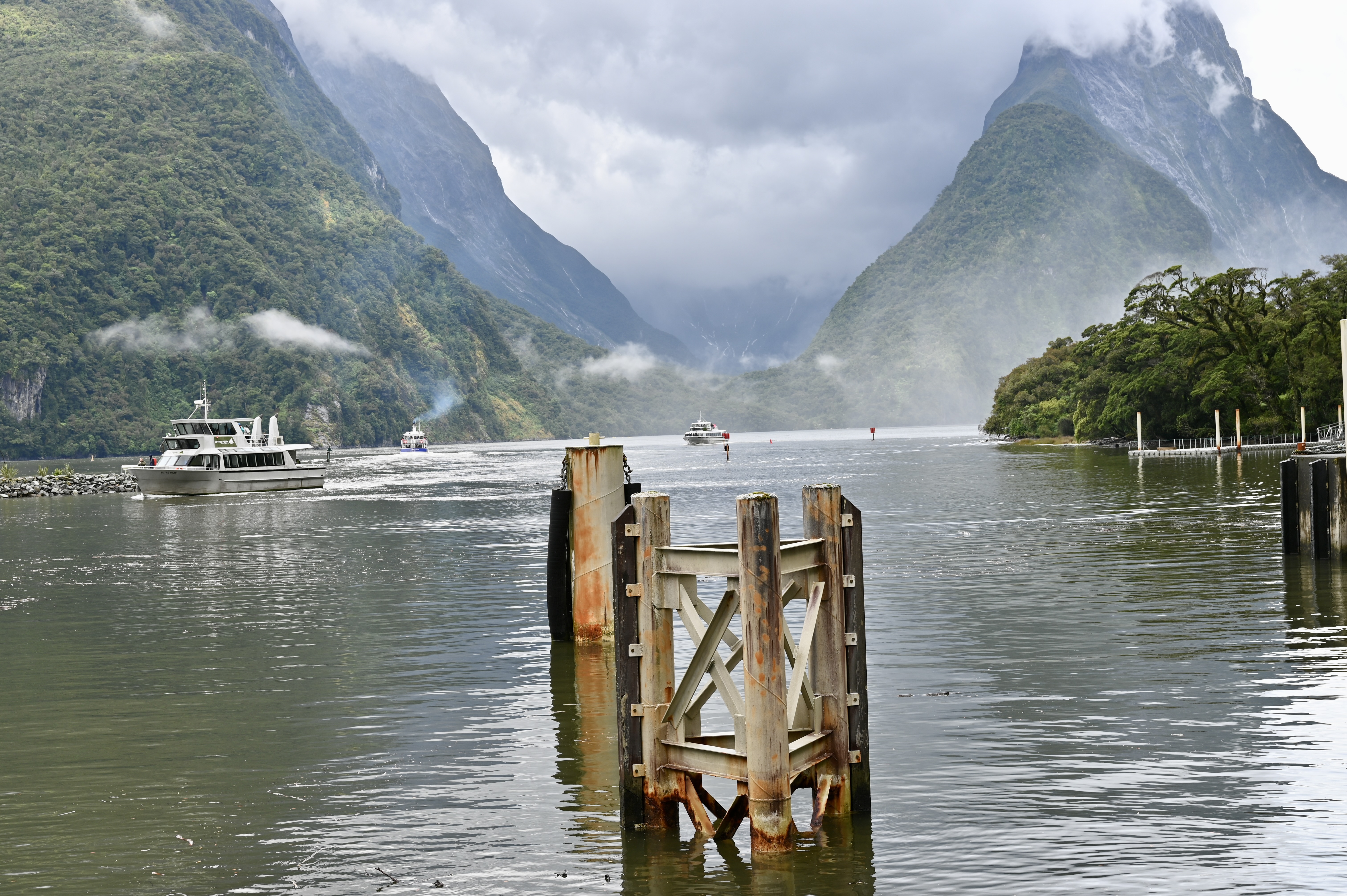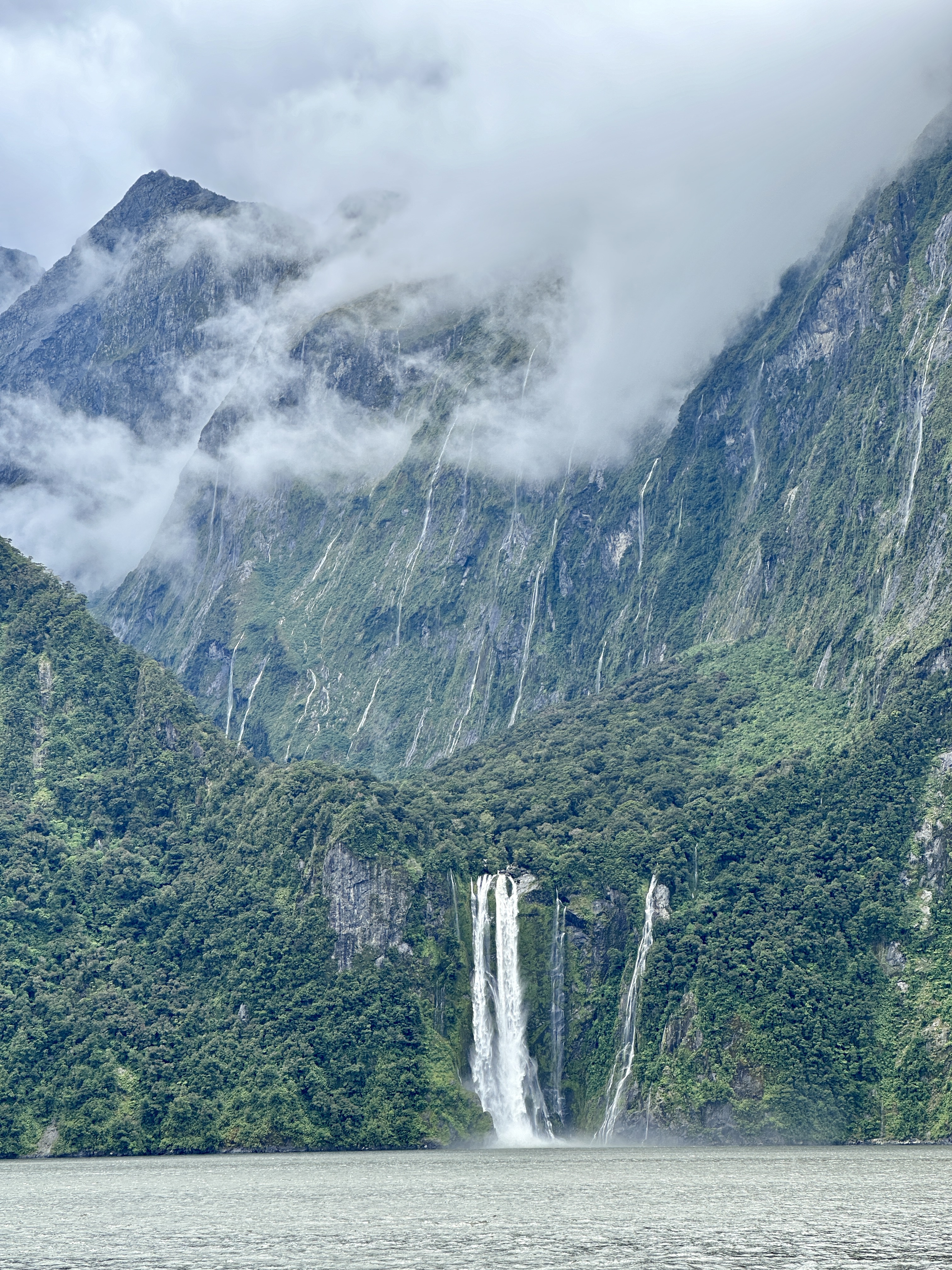 Roughly two hours by bus from Te Anau lies Milford Sound (actually a fjord, but if flies can be worms, fjords can be sounds). During the drive it rained steadily, and ribbons and braids of mist hovered above the ground and shrouded the mountains.