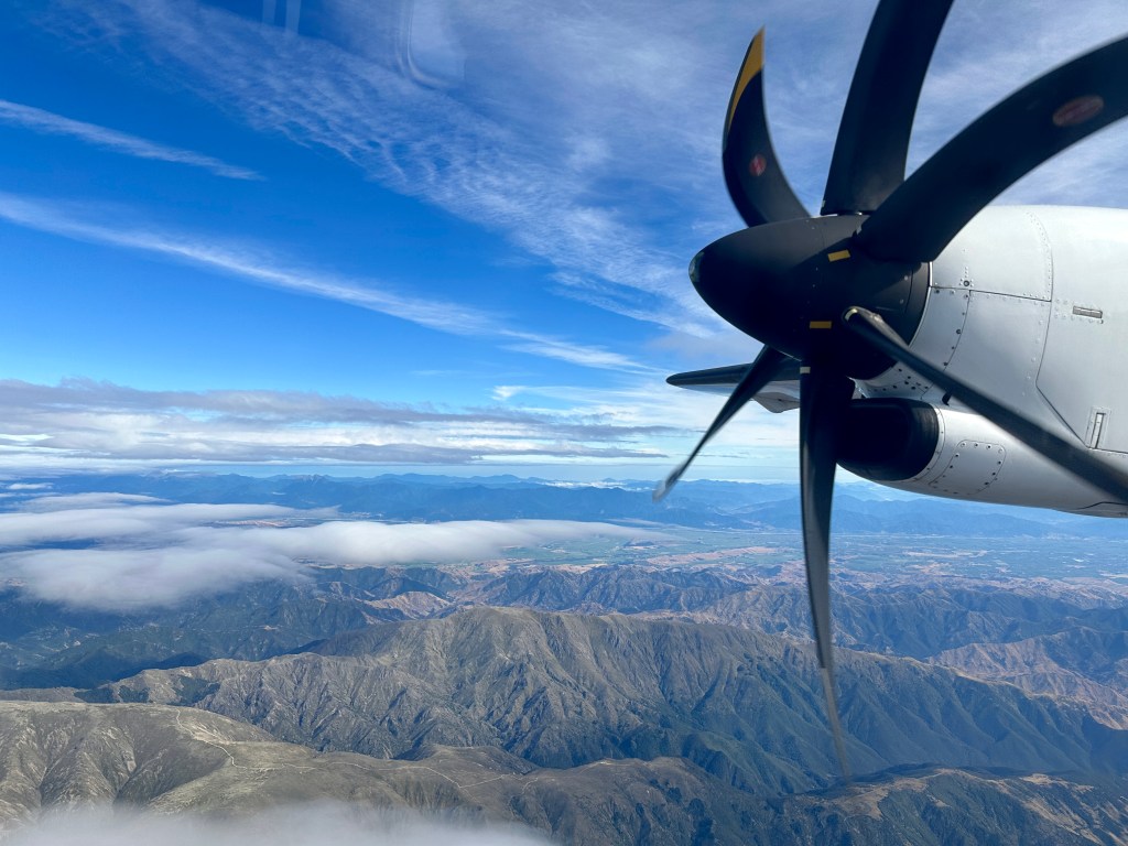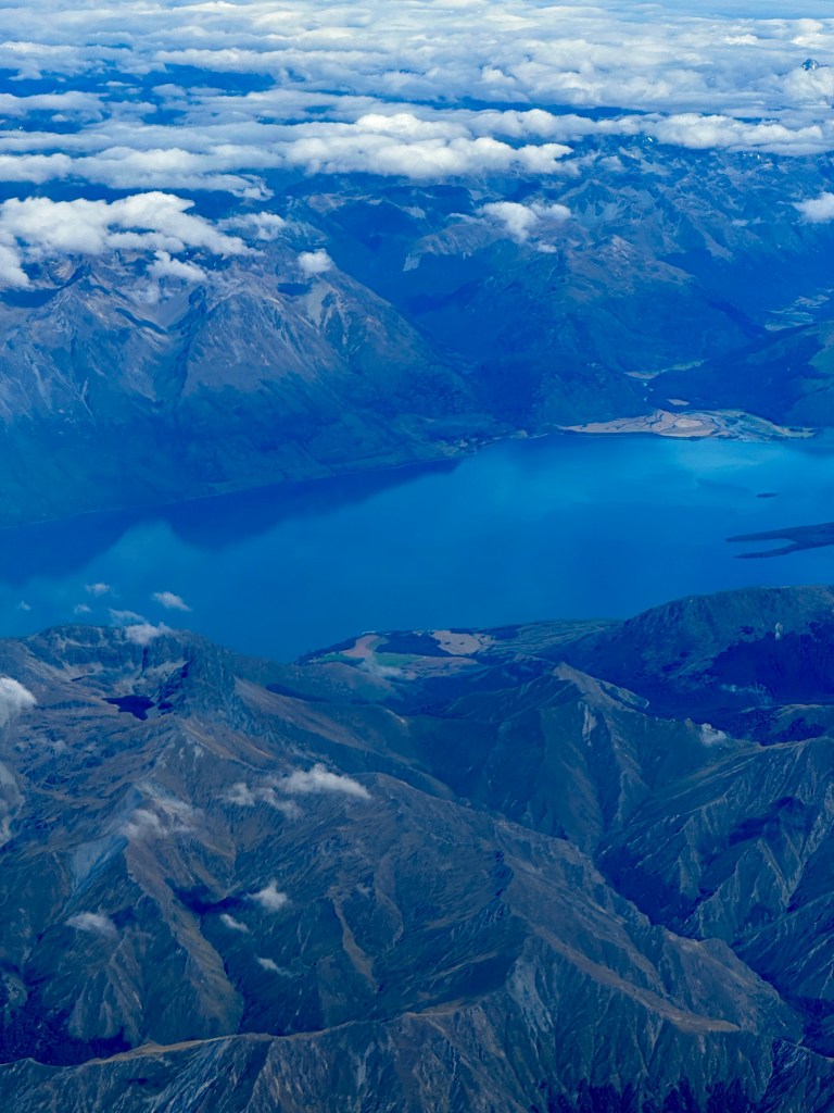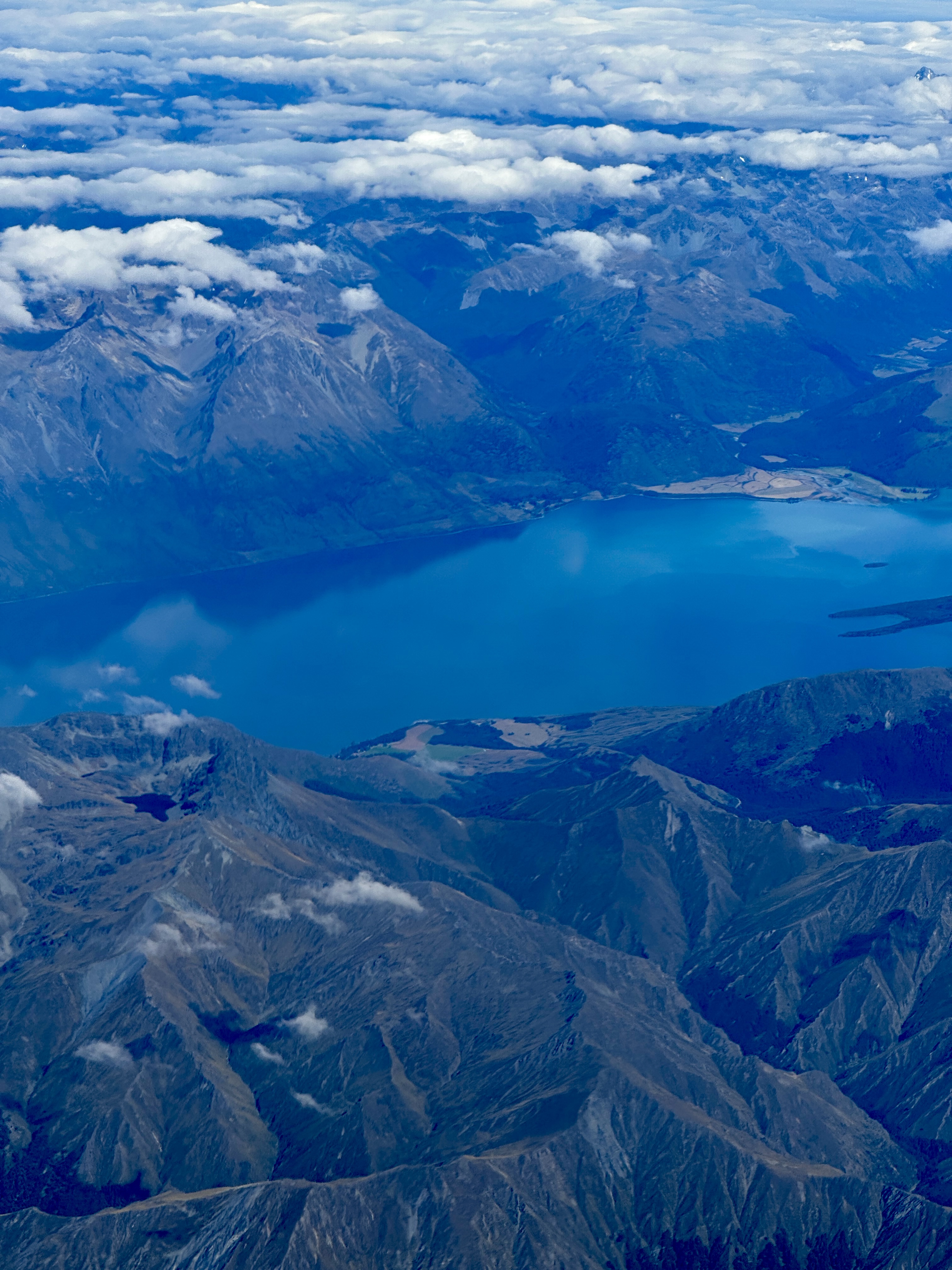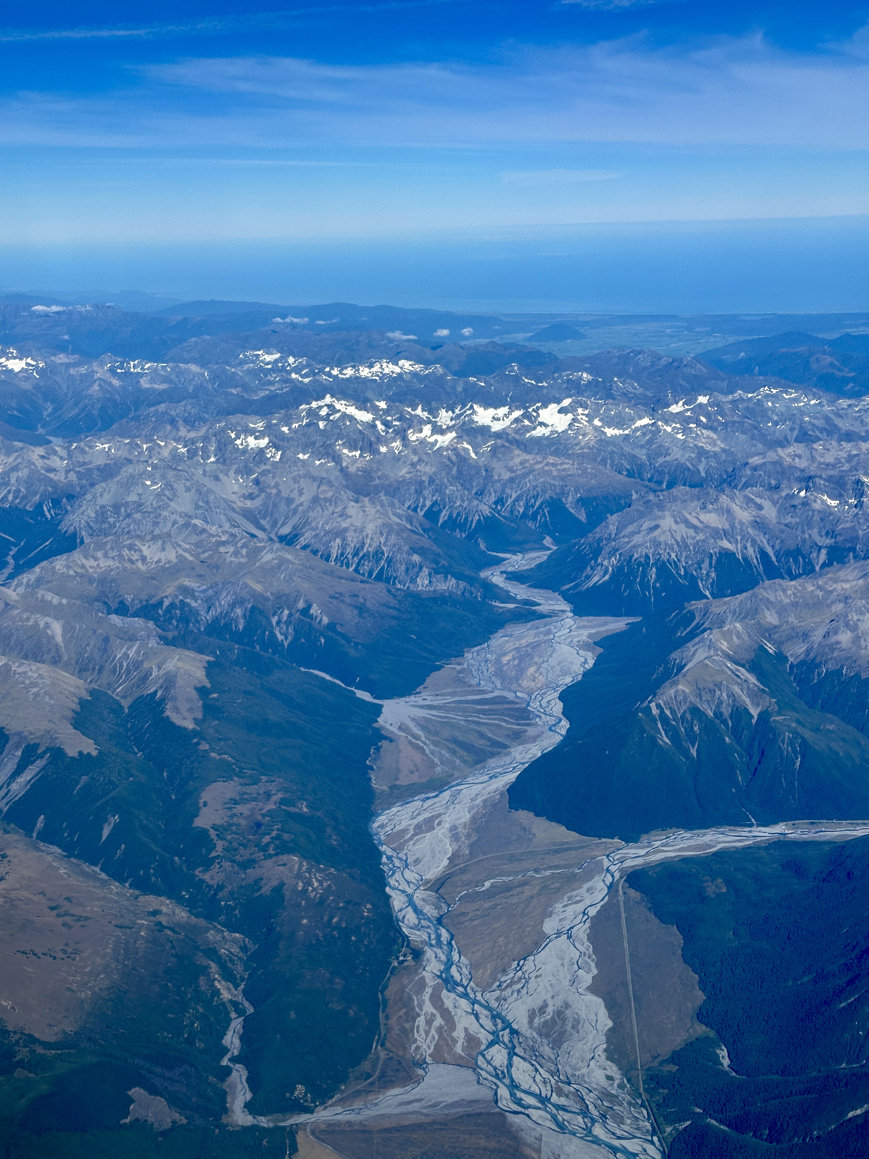 To get from Blenheim to Te Anau, we flew over the Southern Alps, the range running roughly north-south on the South Island. The views out the window were glorious.