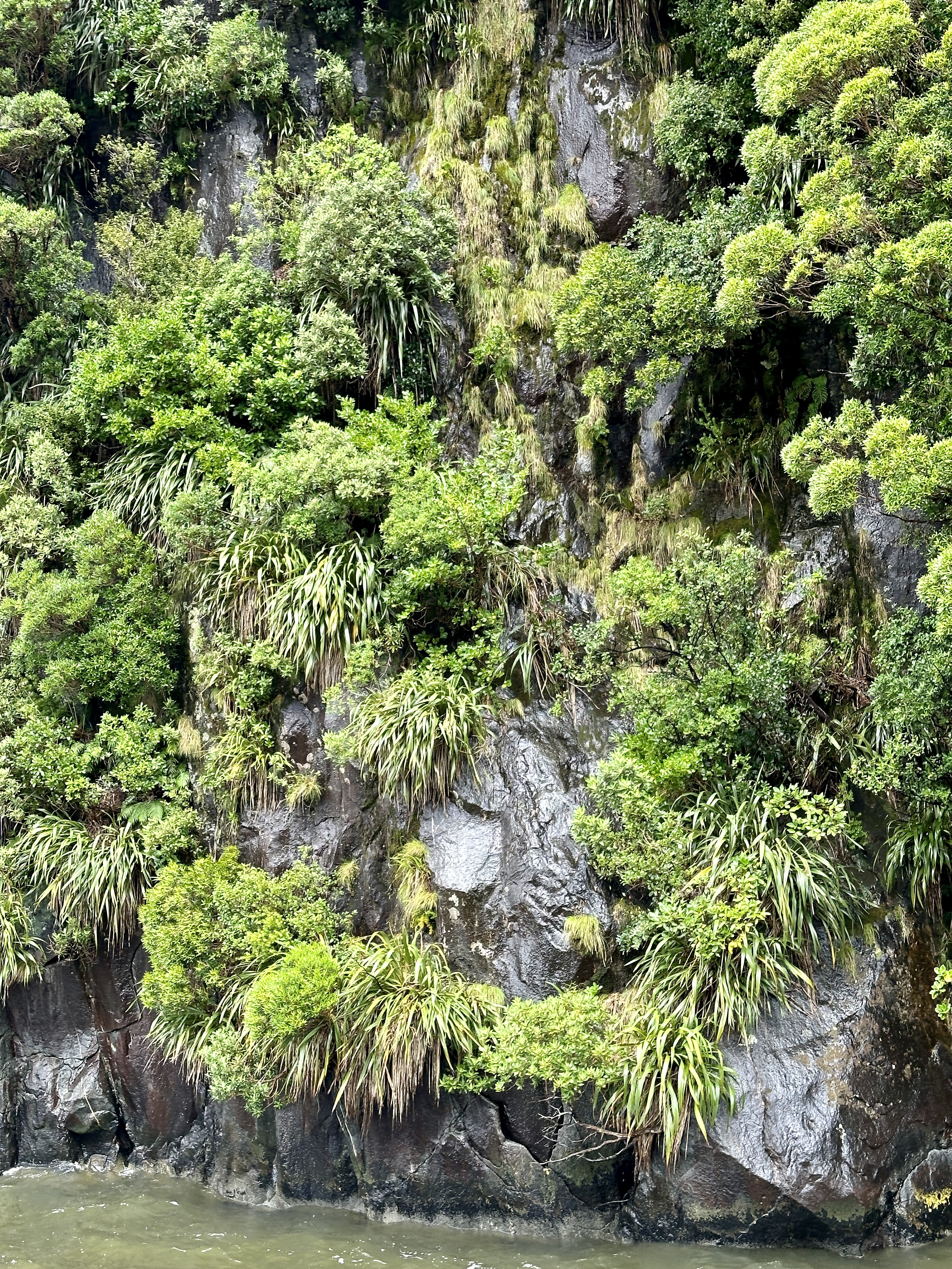 Milford Sound extends 10 miles inland from the Tasman Sea. It’s surrounded by steep mountains bearing evidence of recent avalanches and “tree slides” (trees cling precariously to the sheer mountainsides and if a tree falls in this forest you hear it: it often knocks several hundred other trees to the ground on its fall to the water below).