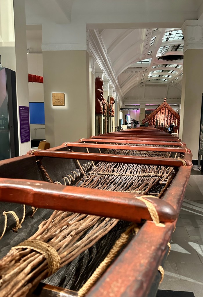 The Museum also features an extensive display of Māori artifacts, including a war canoe capable of holding 100 warriors, an intricately carved storehouse, and a meeting house.