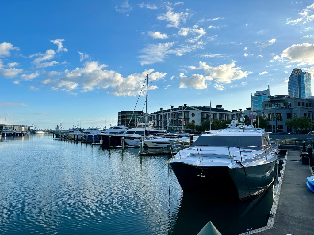 Auckland faces onto Hauraki Gulf, roughly two-thirds of the way up the North Island. We were fortunate to have two days of beautiful weather to explore the area. Our hotel (the Sofitel, generic modern) abuts a yacht-filled marina, and a walking path extends along the adjacent harbor for several kilometers – a perfect (if largely theoretical) venue for burning off recent indulgences.
