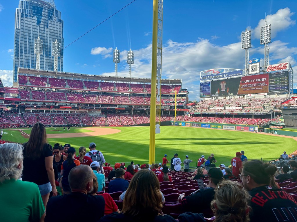 The stadium itself has good sight lines (we sat one row down from the concourse by the right field foul pole and could see everything), and the crowd (both Reds fans and those rooting for the Tigers) was loud and enthusiastic.