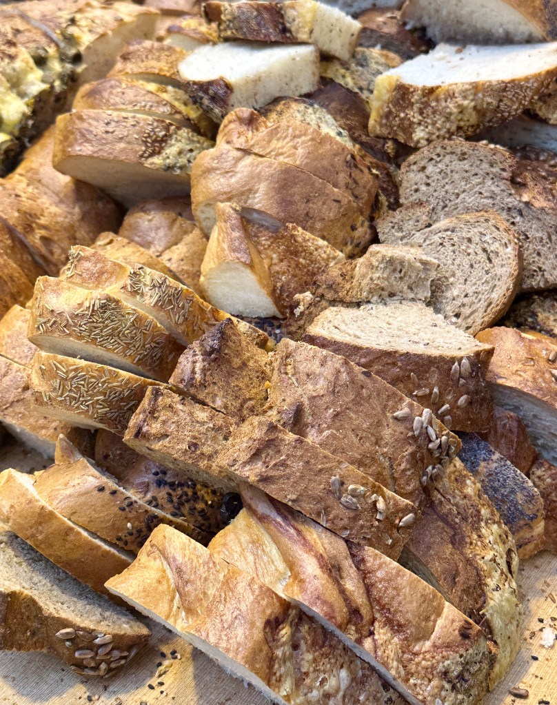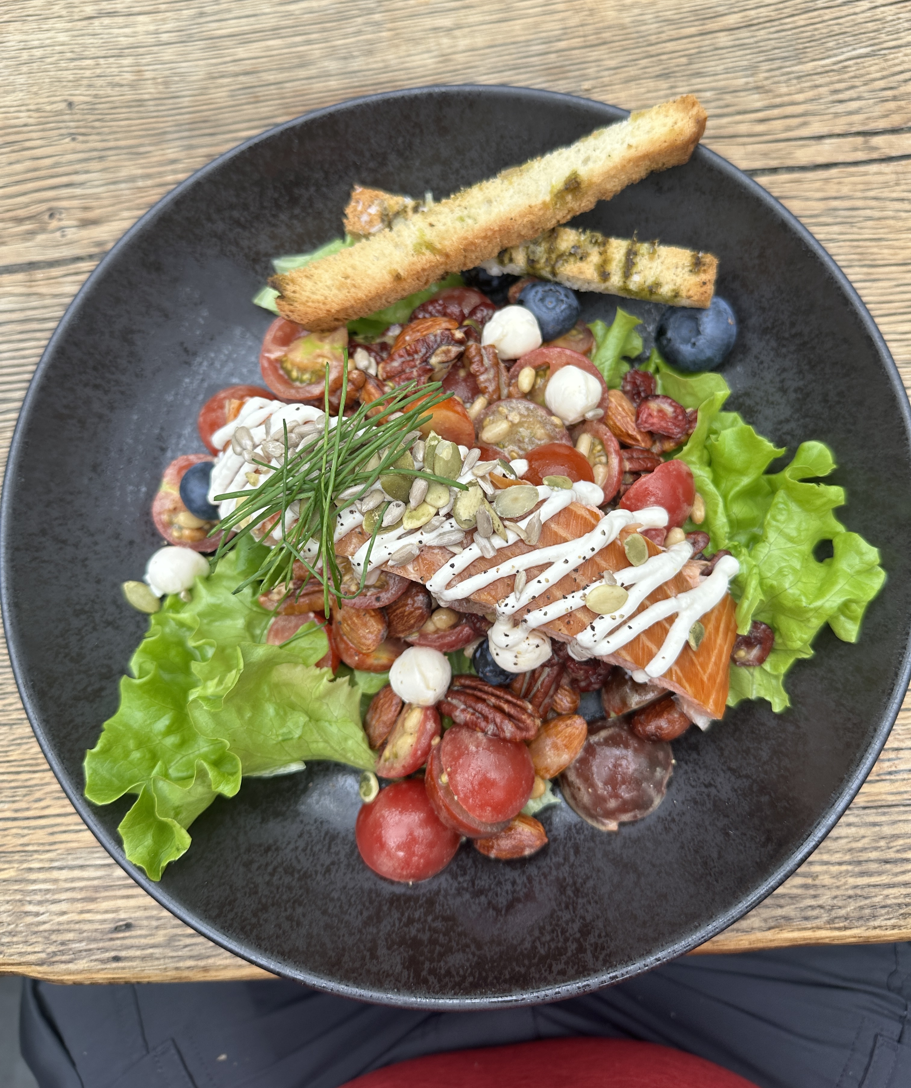 Our group had a fixed menu, but what a treat: a savory tomato soup served with freshly made bread, followed by one of the best salads I’ve ever had – cherry tomatoes as sweet as candy, mozzarella pearls, basil, pecans, and almonds, topped with a smoked filet of salmon. (There was also a vegetarian option, lamb, or duck.) I tried a tomato IPA, which was quite nice, and I’m not an IPA fan.