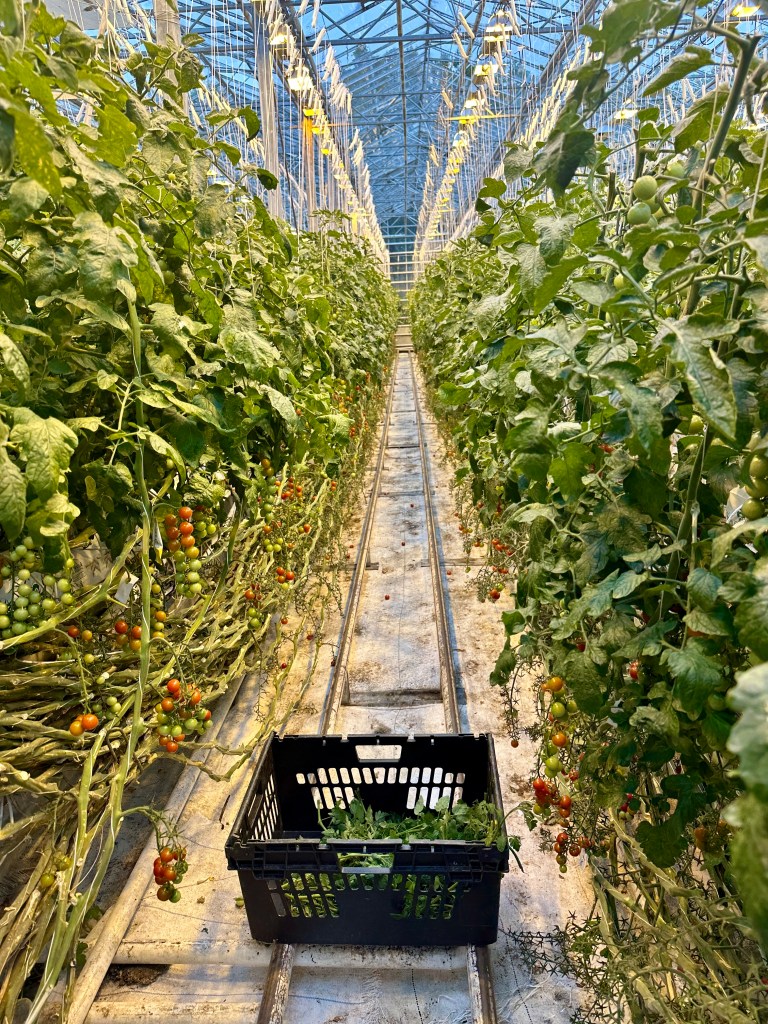 It’s an international production – the soil comes from Sri Lanka and the bumblebees that fertilize the plants come from the Netherlands. No pesticides are used, and the climate in the greenhouses is controlled by water from geothermal springs. The farmhands pick two tons of tomatoes each day – roughly 165 pounds for each of the 24 workers!