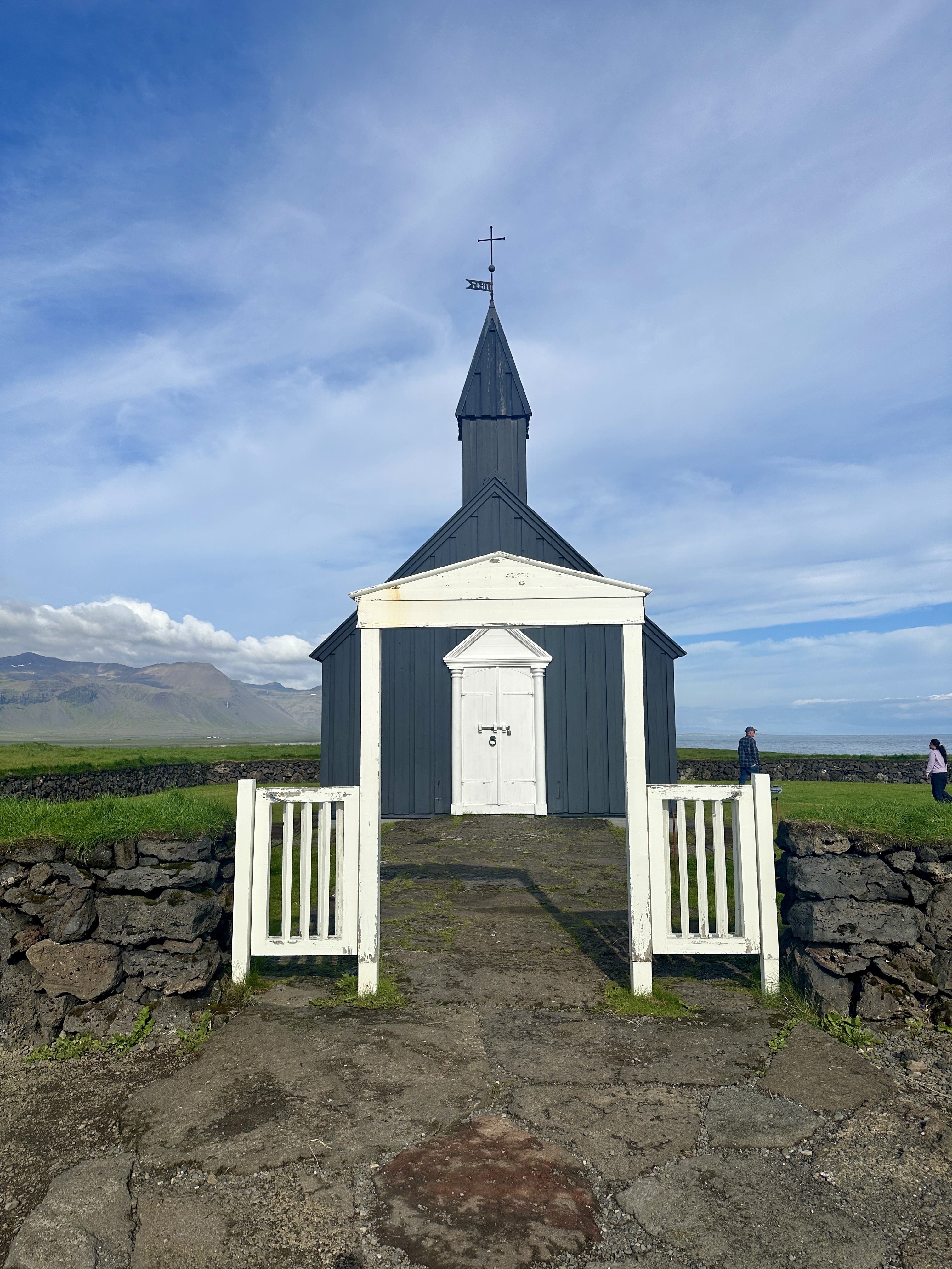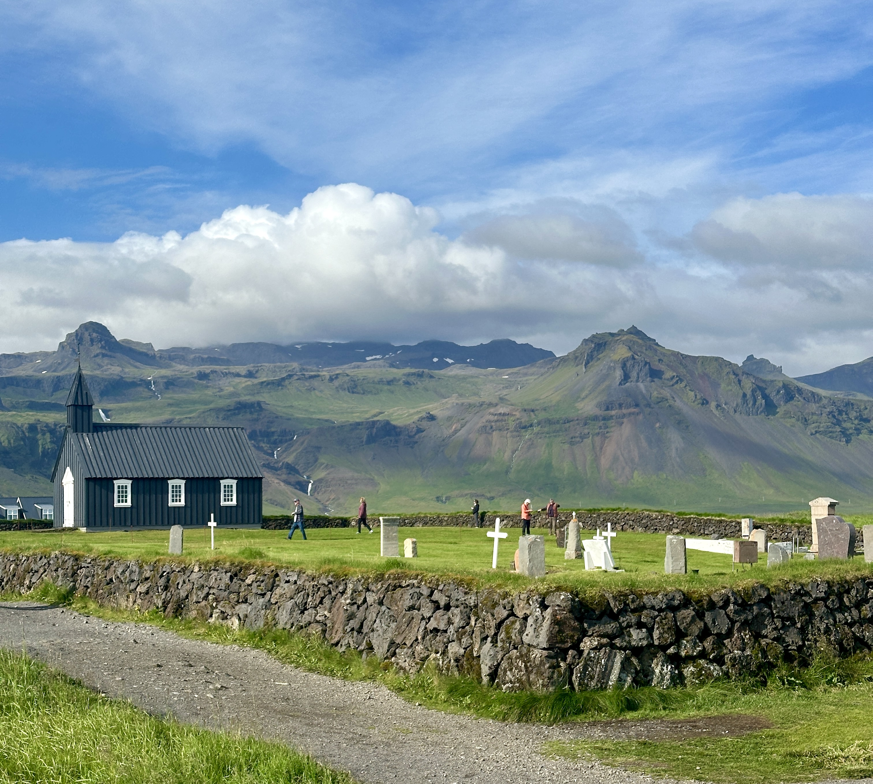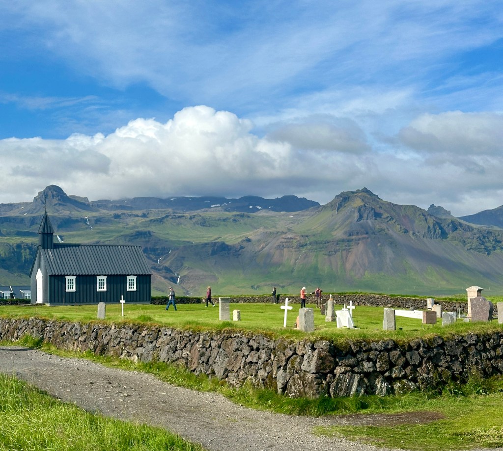We ended the active portion of the day more gently, visiting Búðir, the “Black Church” (creatively named for its appearance; most Icelandic place names are blandly descriptive). The church, built in 1847, is no longer in use but is well-preserved. Adjacent to the church is a small cemetery, set a couple of kilometers from the mountains and just tens of meters from the sea. Not a bad place to spend eternity!