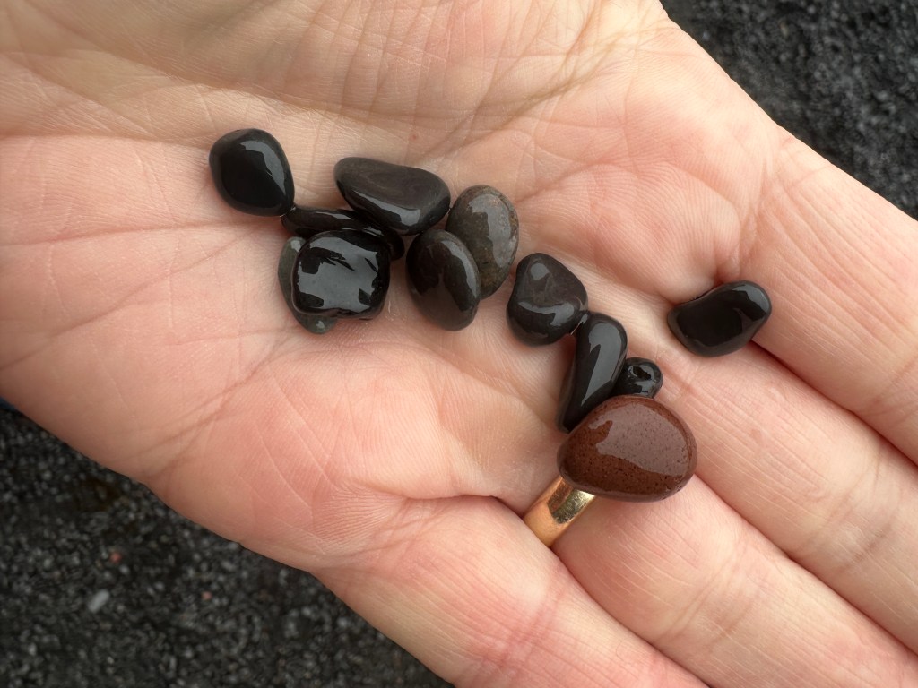 The black sand forms from ground-up basalt and obsidian. Away from the water, the beach turns from coarse sand to beautifully polished black stones.