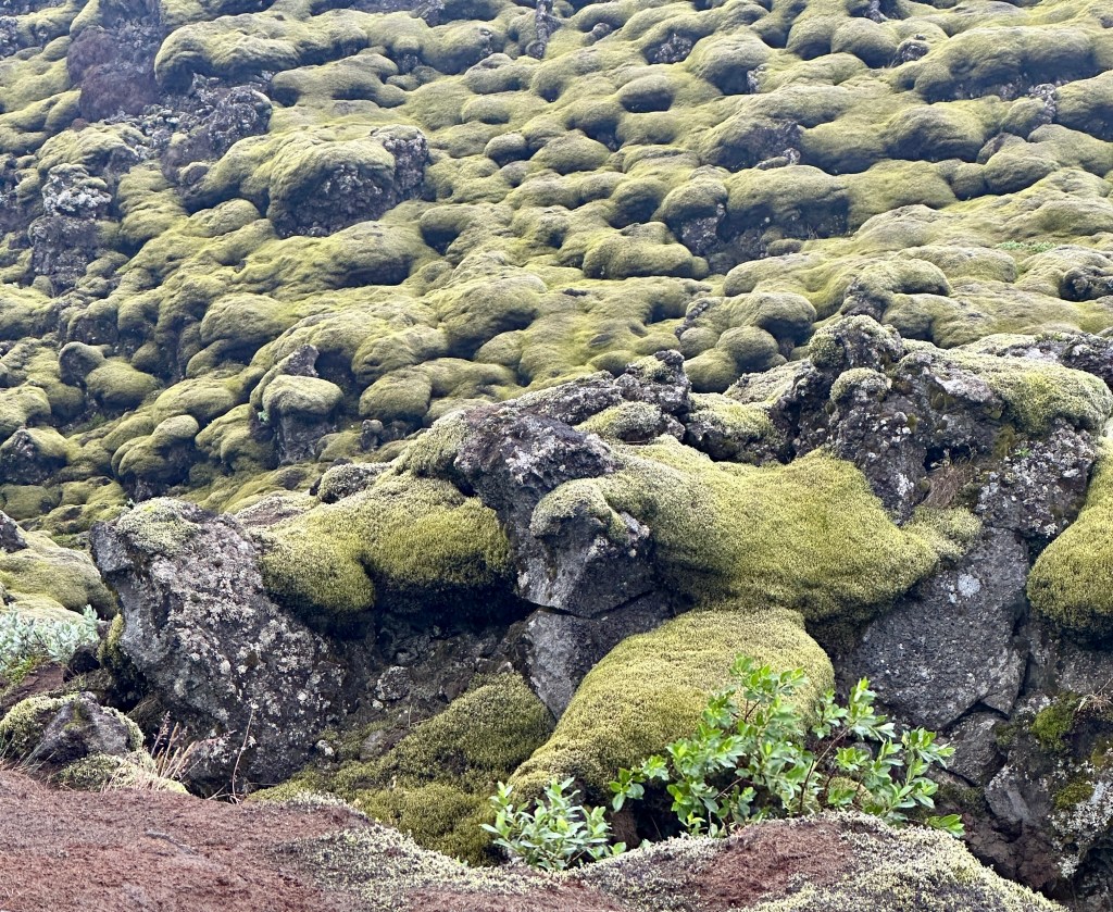 Eldhraun (“elf lava”) is a massive lava field formed from a 1783 eruption that lasted for eight months. It covers hundreds of square kilometers – basically, from the inland horizon to the sea – in pillow-shaped boulders (fancifully thought of as elves’ houses) and spongy moss, which can be as thick as 40 centimeters.