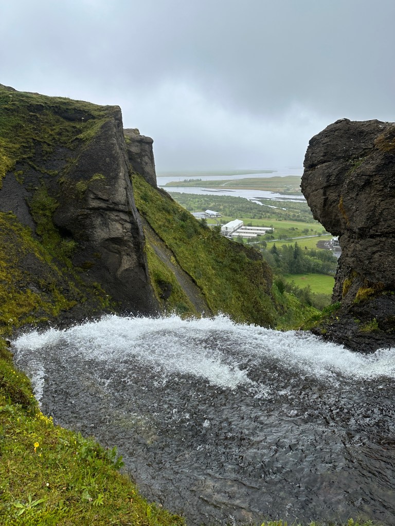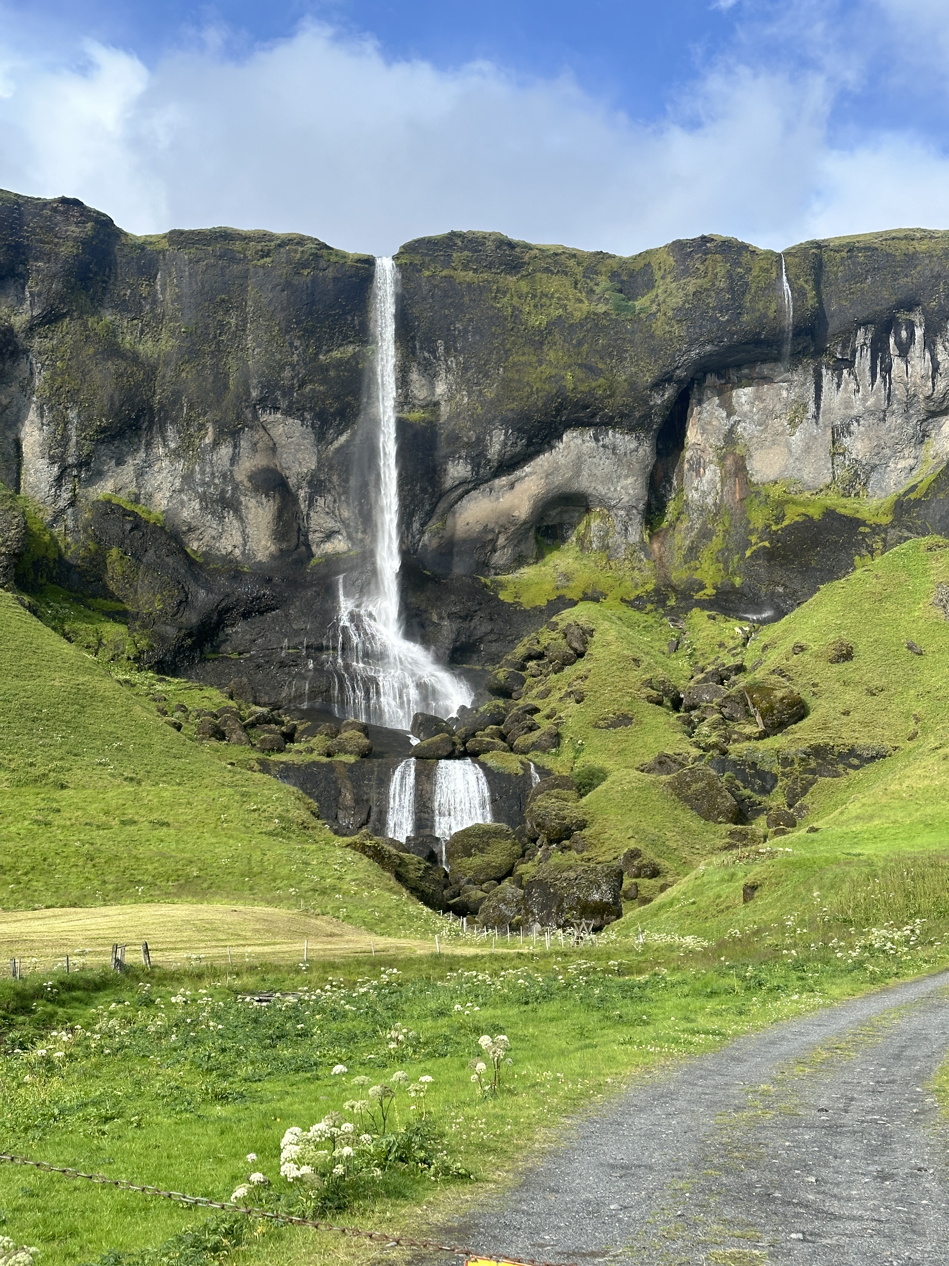 Another day, another uniquely breathtaking (in two senses) waterfall. If you want to see it, head to “Kirkjubæjarklaustur in Skaftárhreppur” (thanks, Wikipedia); say that three times fast. Systrafoss cascades down the mountainside like a two-lane road. For much of its length, the falling water is divided by a rocky ridge.