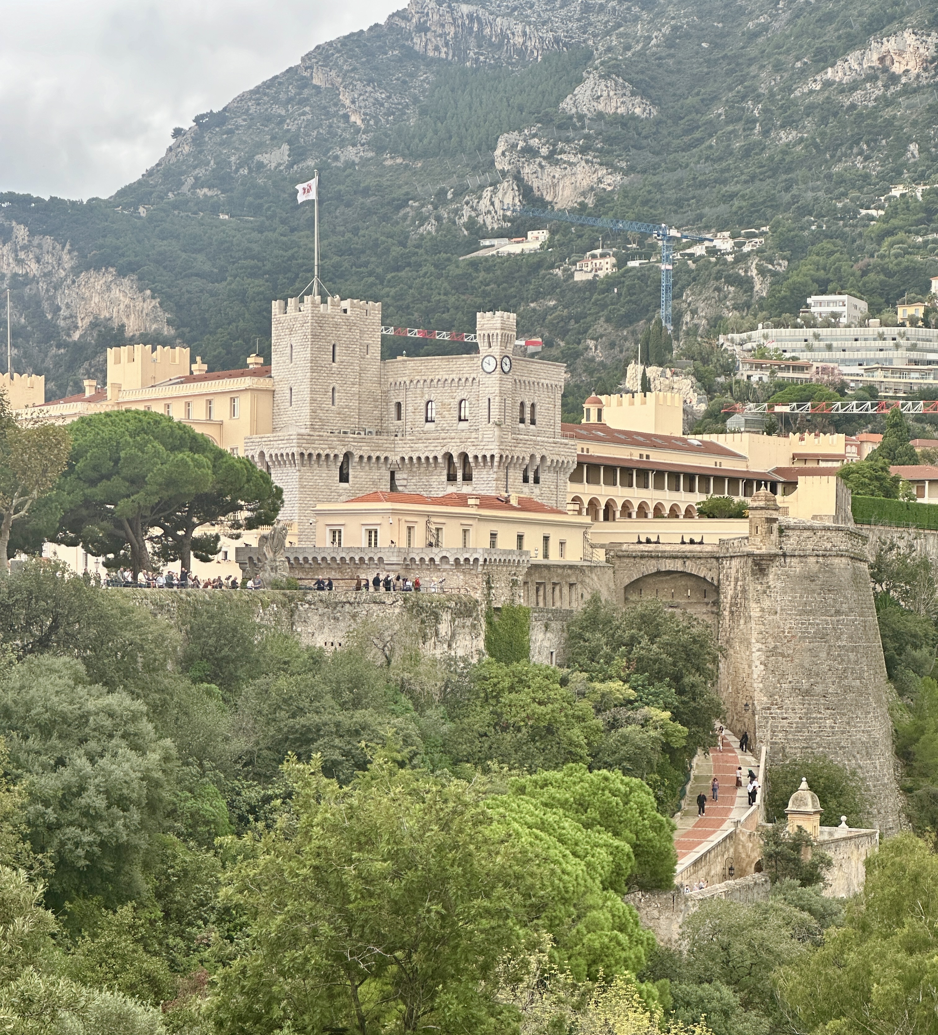 The Palais Princier. Towering over the market and surrounding area, the Palais Princier is a castle with commanding views of the harbor, the mountains, and Monte Carlo. Here’s where the vertiginous hills I mentioned earlier come into play: to reach the castle by foot, you must ascend a fairly steep road with scattered steps for a total elevation gain of around 200 feet.