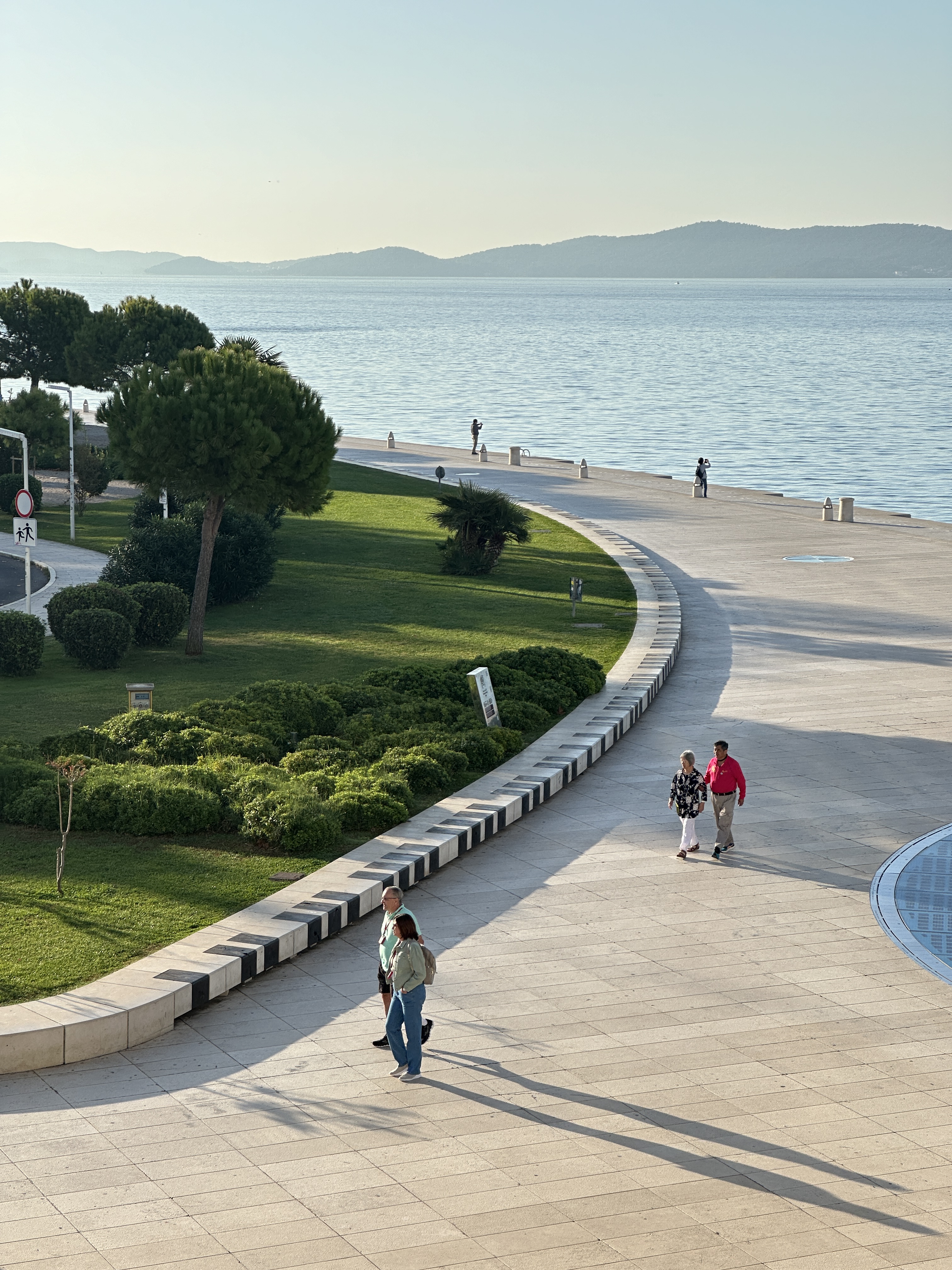 When I woke up this morning, I looked out the window and saw a long, curving seaside wall that reminded me of a keyboard. It turns out that when the city seawall was rebuilt in the early 2000s, an architect named Nikola Bašić designed a “sea organ,” where incoming waves enter a series of resonant pipes, producing organ-like tones. I visited the installation after returning from the hike; the following video shows the ship; the sound in the background is the sea organ.