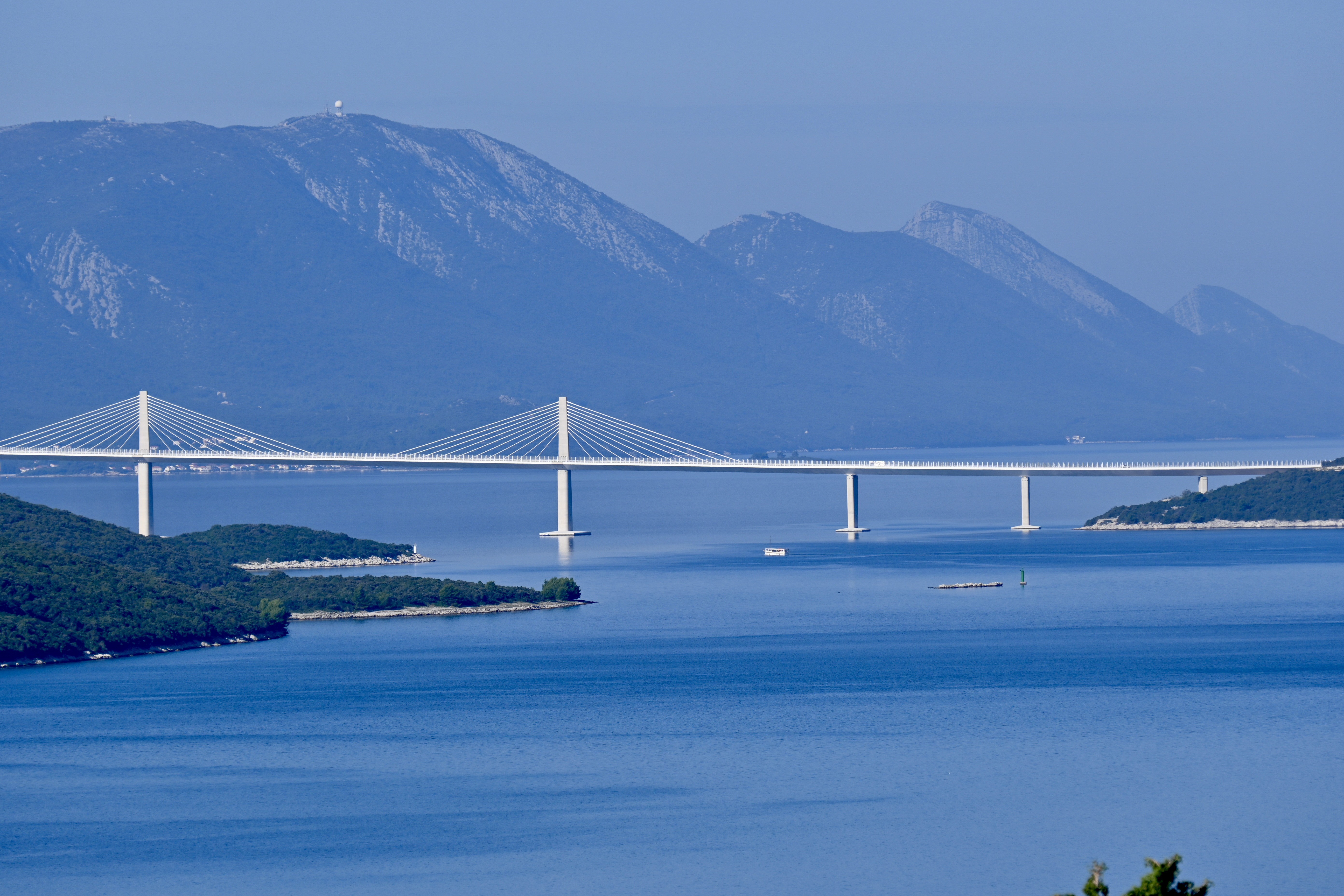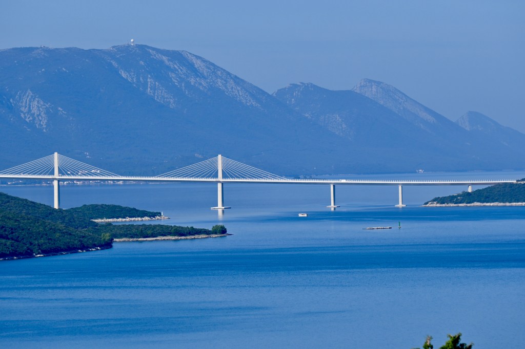 After clearing border control, we stopped in the town of Neum, the only place in Bosnia and Herzegovina that touches the coast. The main highlight of Neum is the view toward a graceful bridge that opened a couple of years ago so that Croats could travel from north to south without having to cross B-H. A subsidiary but important highlight: free, clean rest rooms.