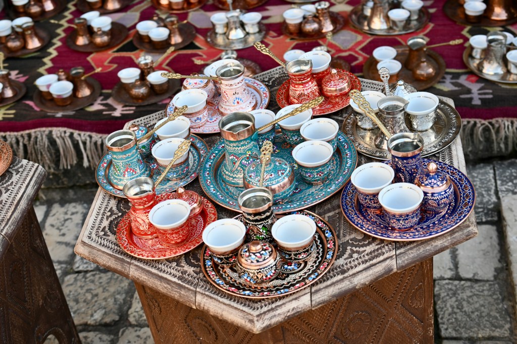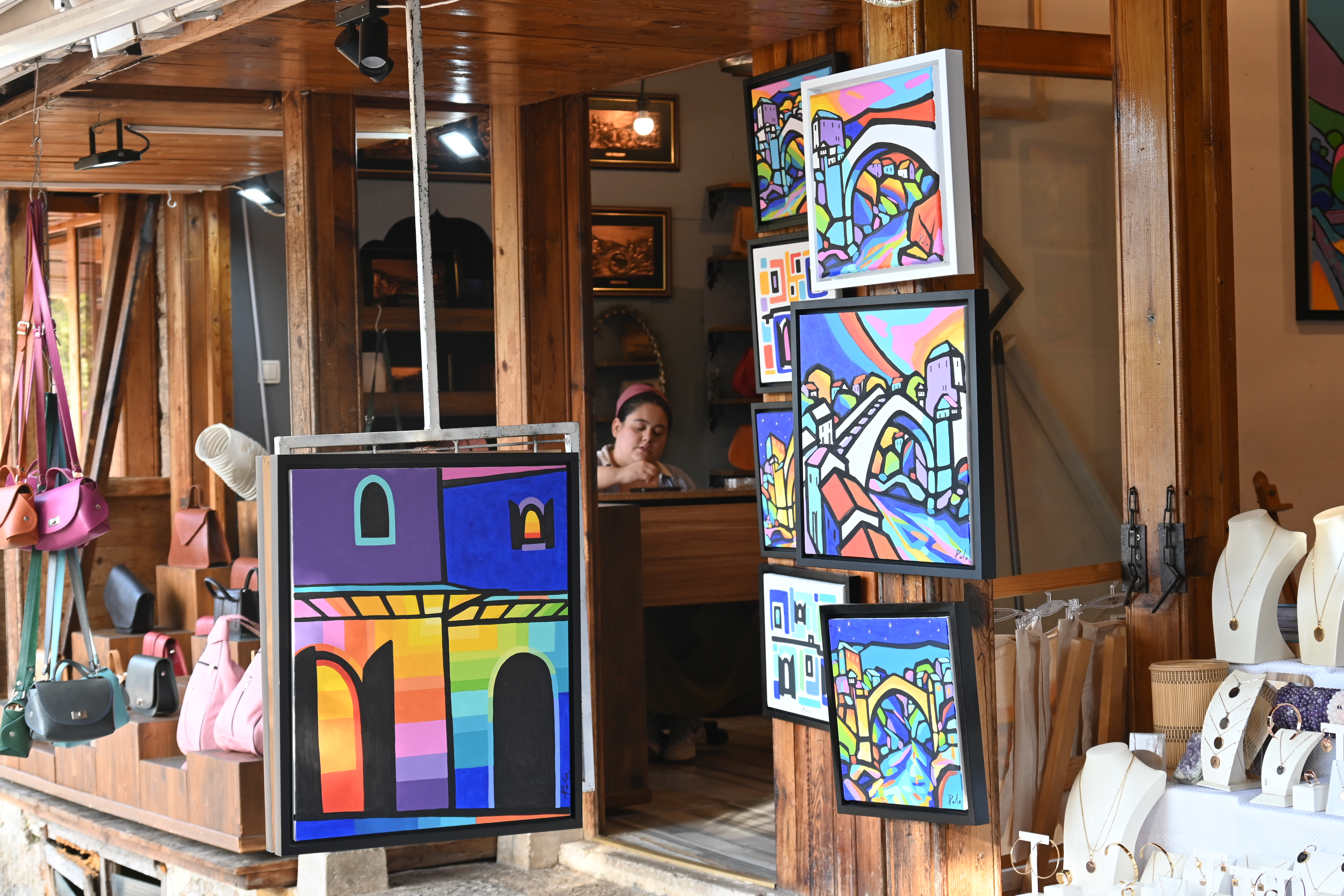 Across the bridge, a cobblestoned lane is lined with artisans’ shops; Mostar is renowned for its copperwork, jewelry, and wool products.