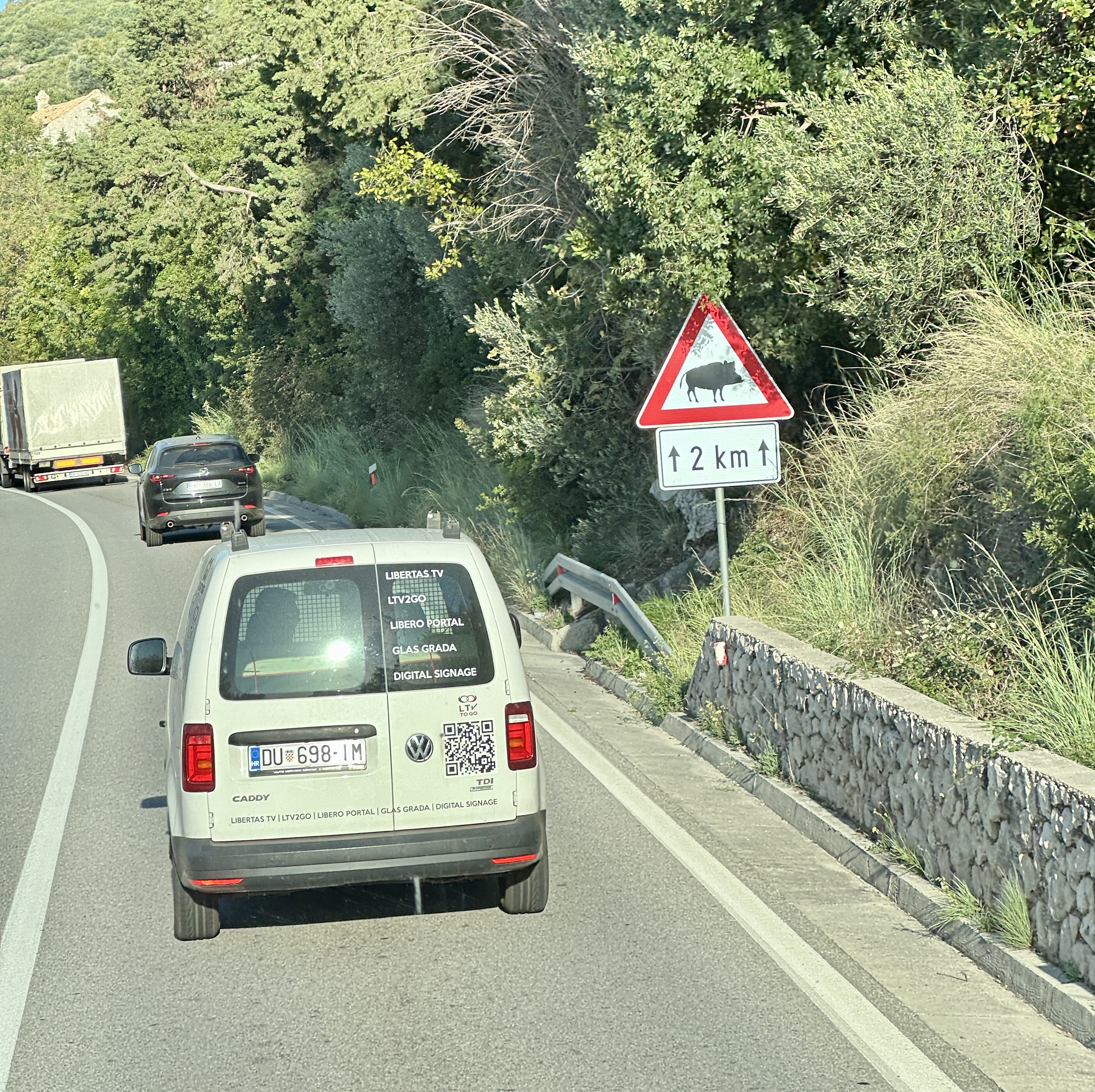 The first hour or so of our ride to Mostar followed a winding but well-maintained two-lane road with the gleaming Adriatic on one side and heavily forested mountains on the other. In fact, the mountain is so heavily forested that there are periodic signs warning people to watch for wild boars crossing the road.