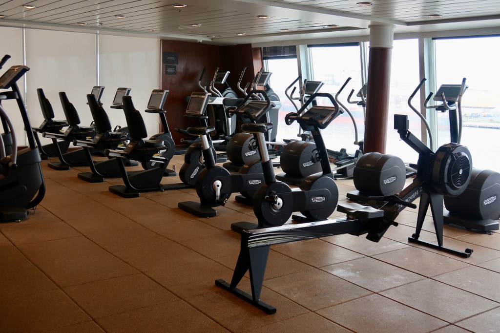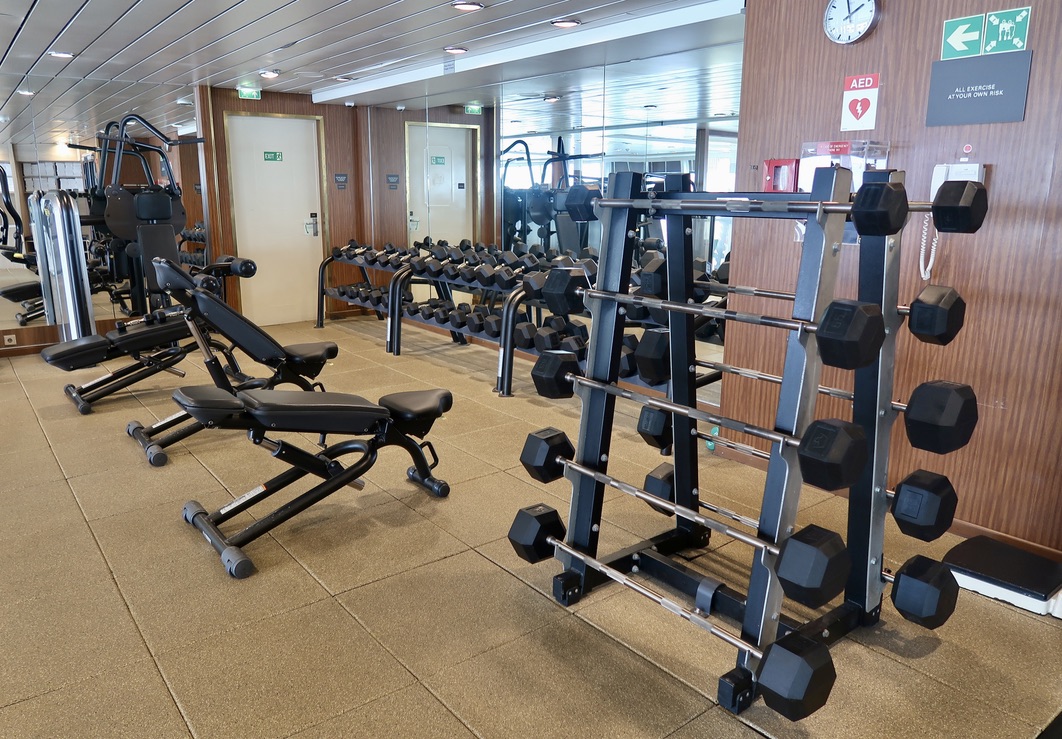 The gym is large and well-equipped, consisting of a room for stretching and classes, a cardio room with bikes, treadmills, and stairclimbers, and a weight room with free weights and machines.