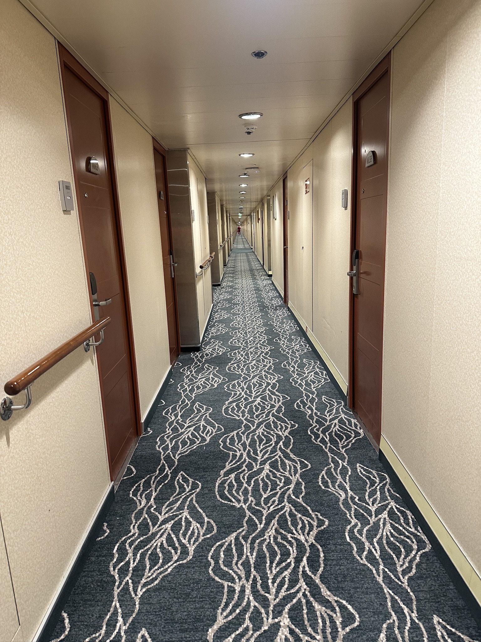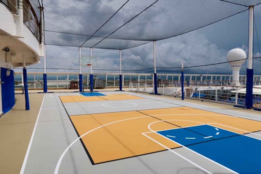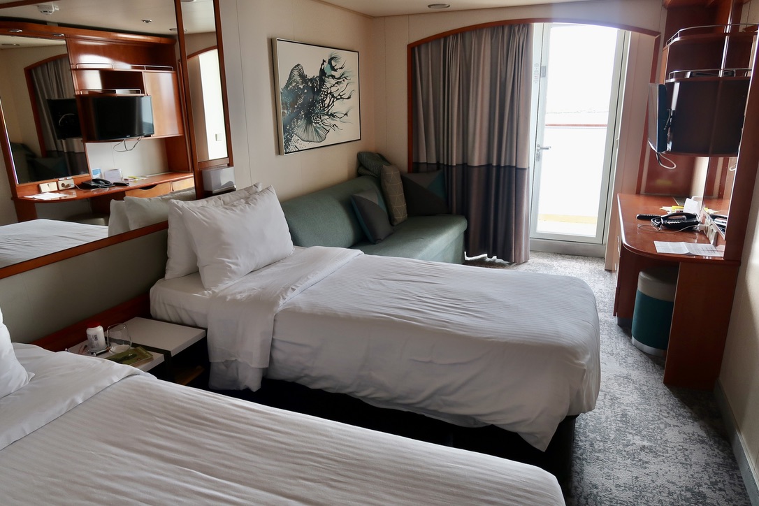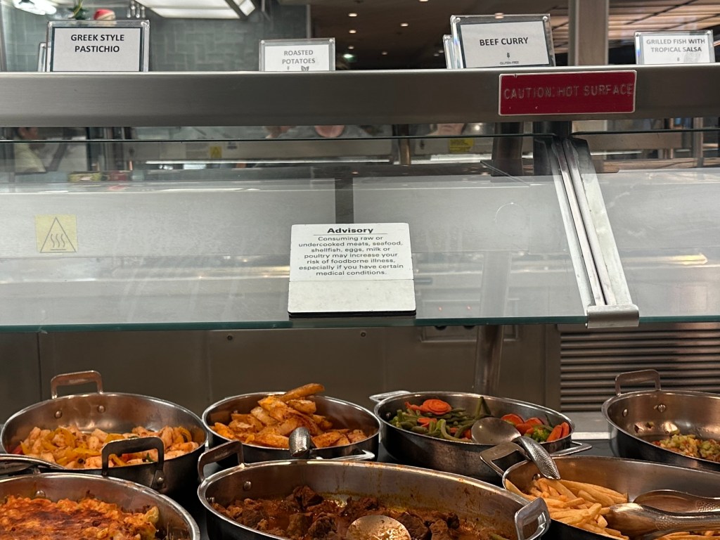 Facilities: B+. Our cabin was a decent size, with more storage space than we needed (in part because my brother only travels with a backpack). Bathrooms on cruise ships are notoriously small; ours proudly upheld that tradition. The cabins have only one US-style plug, in addition to two European-style plugs and two USB-A connections. The ship is clean and well-maintained, but public spaces, including the Garden Café (buffet restaurant) can get crowded.