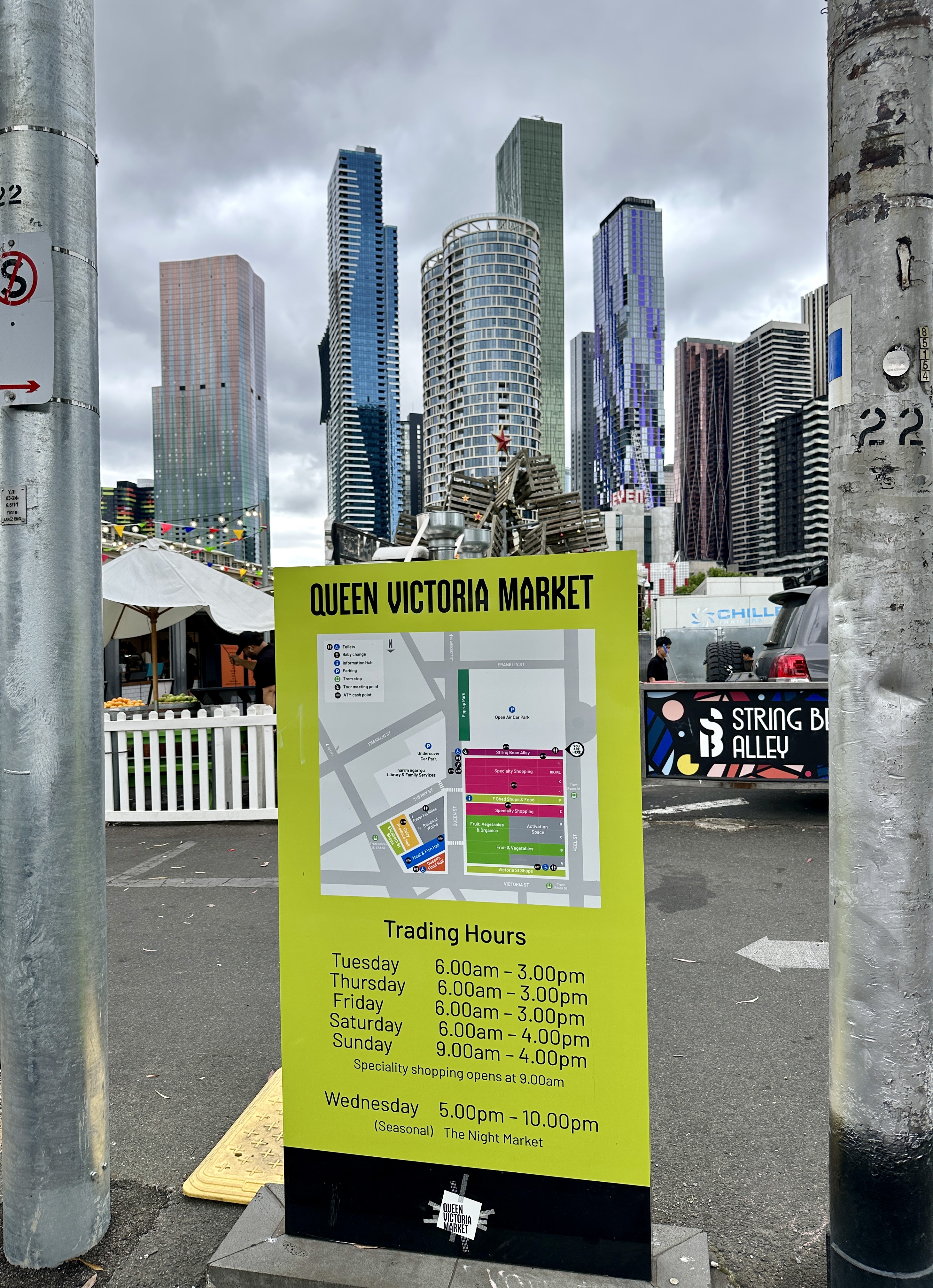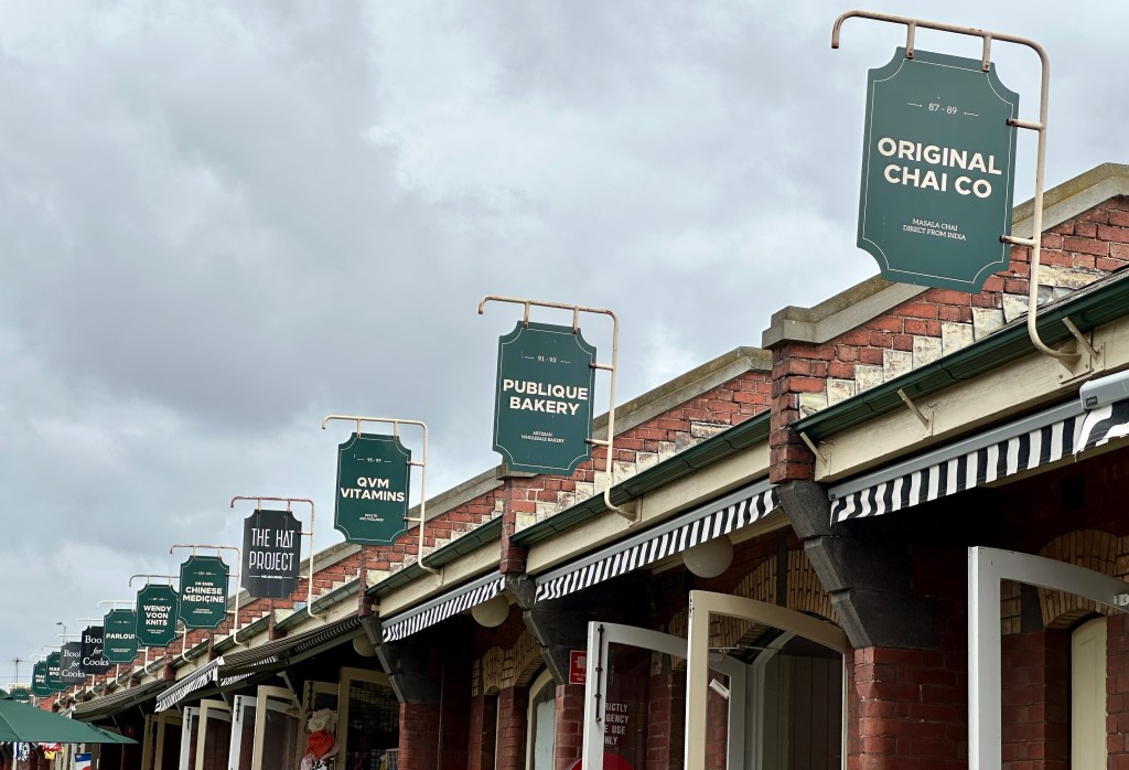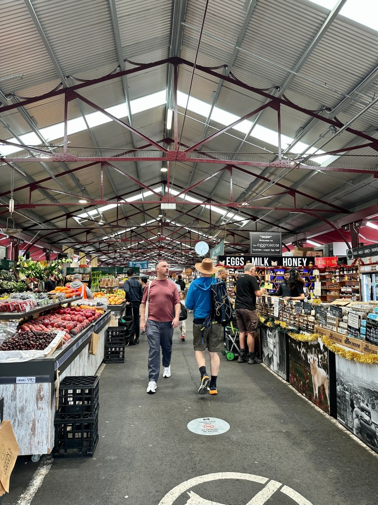 Our first stop was Queen Victoria Market, a large open-air structure with hundreds of stalls. Merchants in one half of the market sell clothes, gems, souvenirs, hats, records, and just about anything else that’s not edible (unless you’re a goat).