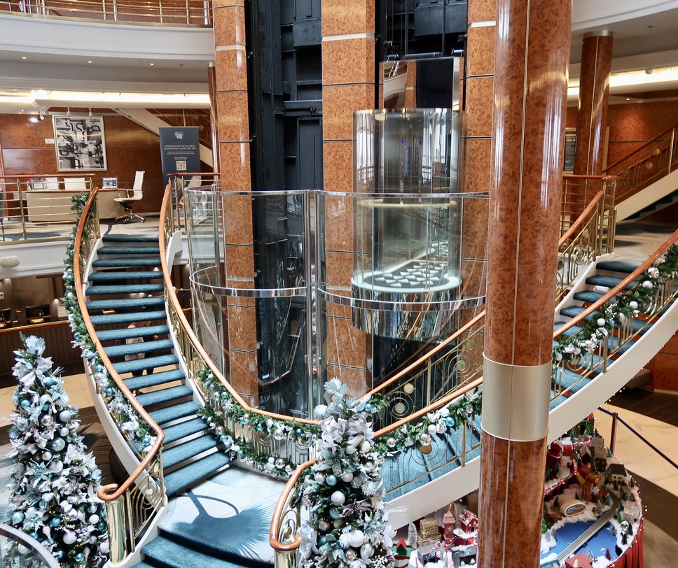 Entertainment: C+. The ship’s production shows (featuring the on-board singers and dancers) are excellent; indeed, the second show, “Rock You Tonight,” was among the best I’ve seen on any cruise. Unfortunately, there were only two of these shows on an 18-day cruise. The outside talent was mostly medicore. A comedian told jokes about cruise ship toilets and people overeating at the buffet, which I remember hearing on cruises in the 1970s. A magician performed timeworn tricks with ropes and metal rings. There was a decent pianist/singer, though at times he reminded me of the Bill Murray lounge singer character on SNL. The highlight, by far, was a quirky comedian/juggler/inventor named Joel Salom, whose robotic dog (Erik) is hysterical – Salom received a golden buzzer for his Erik act on Australia’s Got Talent.