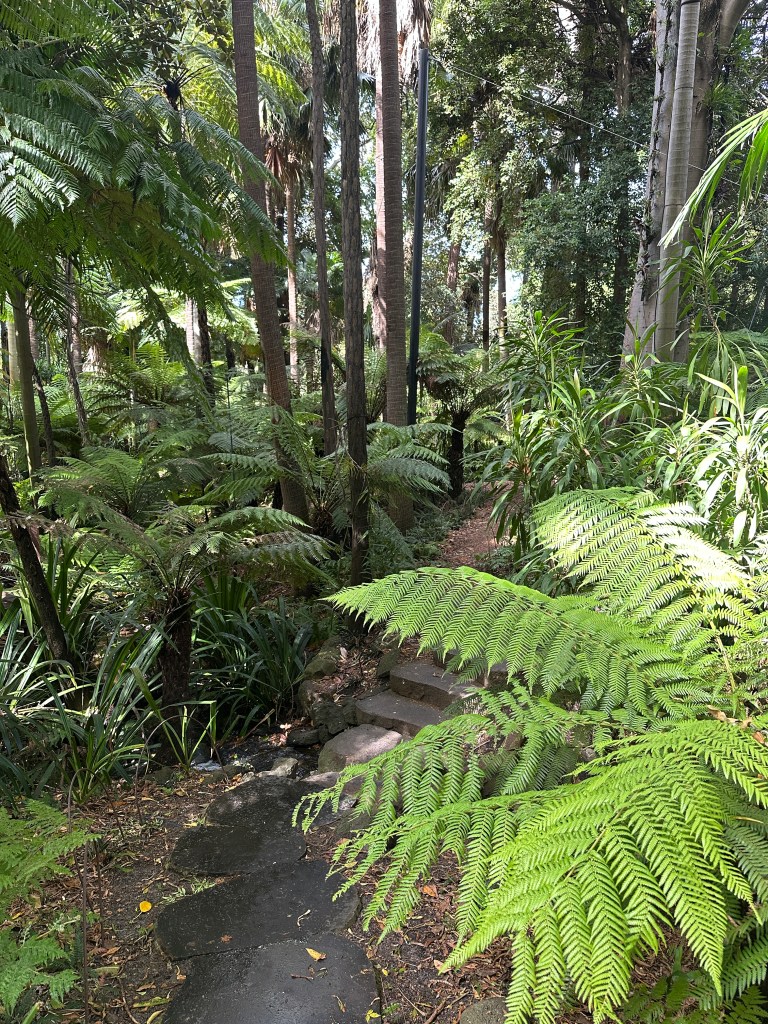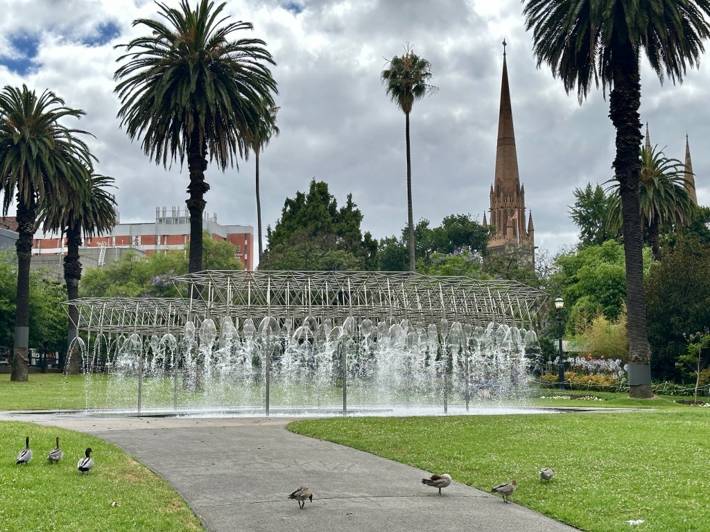 We got off at the stop for the Shrine of Remembrance – which is well worth visiting; I spent some time there last January – and walked uphill past the Shrine to the Observatory Gate to the Gardens. Admission is free. We ambled along the Forest Walk, cut over to the Fern Gully, and circled one of the lakes. If you’re in Melbourne, the Gardens are a not-to-be-missed attraction: serene, well-marked, and lush.