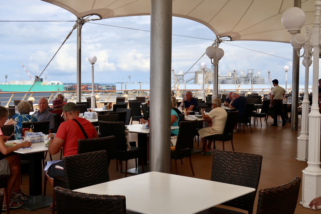 Value: B. This one is hard to judge. Norwegian’s base fares are lower than on Azamara, but Azamara’s fare includes many things that are extras on NCL. For example, Azamara’s base fare gets you a wide assortment of soft drinks, beers, wines, and liquor; on NCL you have to buy an expensive beverage package or pay by the drink. (Beverage packages on Azamara cover top-shelf brands.) Likewise, on my last Azamara cruise, Internet was included; on NCL you have to buy either a package of minutes or a voyage-long streaming package, which bear hefty price tags. And, as I mentioned in my Brisbane write-up, Norwegian did not provide shuttles in any of the ports where we docked outside the city (Brisbane, Fiji, and Vanuatu). In reality, this was only a problem in Brisbane because the distance from port into town (21 km) isn’t walkable. I’m sure Azamara and other higher-end lines would have offered a free shuttle service.