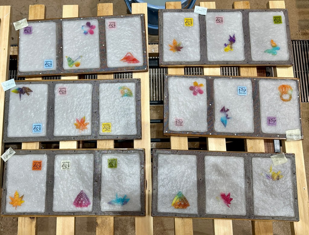 Then it was time for a literally immersive experience. After watching a short video, we rolled up our sleeves and made our own postcards by “scooping, straining, and shaking”: dipping a three-compartment wooden frame into a bath of kozo liquid, gently shaking the frame, and repeating the process two more times before affixing decorations to the nascent paper. The staff then dried and packaged the postcards for us.